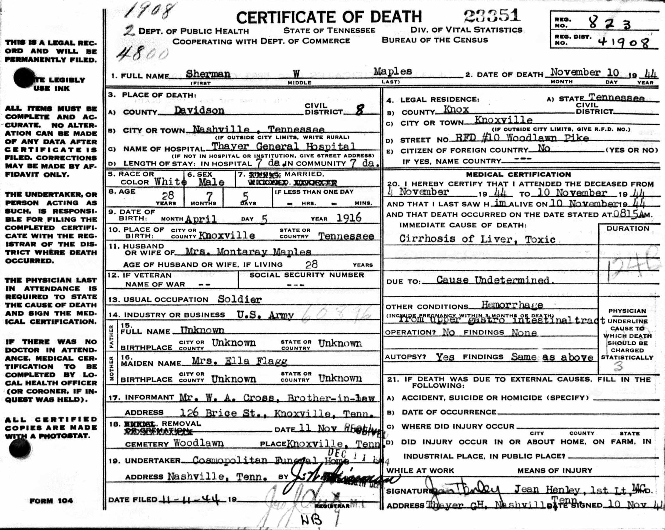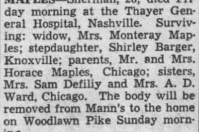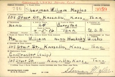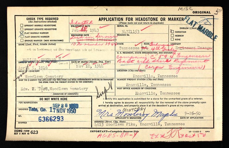 Sherman Maples enlisted on Febuary 10, 1943, in Fort Oglethorpe, GA. He Died non Battle 10 November 1944 at the Thayer General Hospital in Nashville, Tennessee of cirrhosis of the liver.