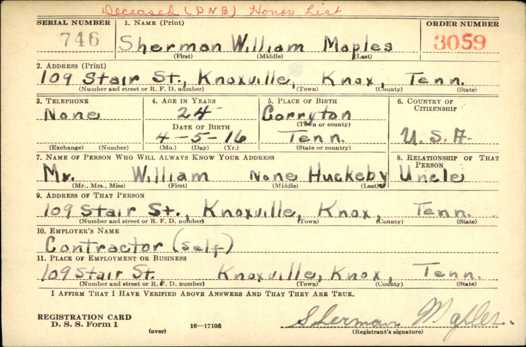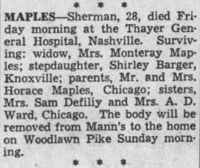 Sherman William Maples was born in Corryton, Tennessee, the son of Horace Irish Maples and Ella Flagg. He was the brother of Evelyn Maples and Mildred Maples. Sherman married Monteray Cross on 25 November 1940. He was the step-father of Shirley Barger.