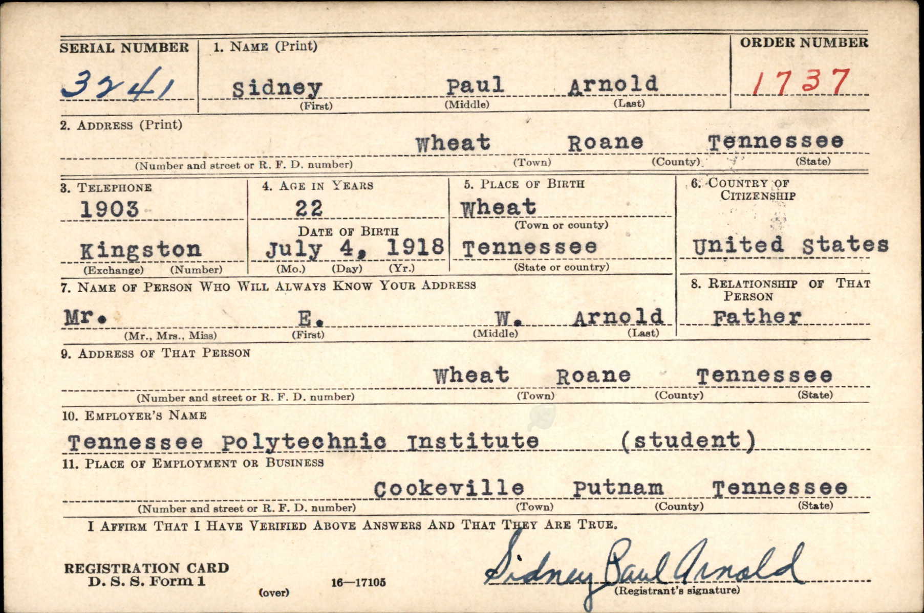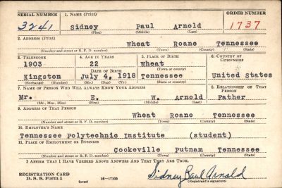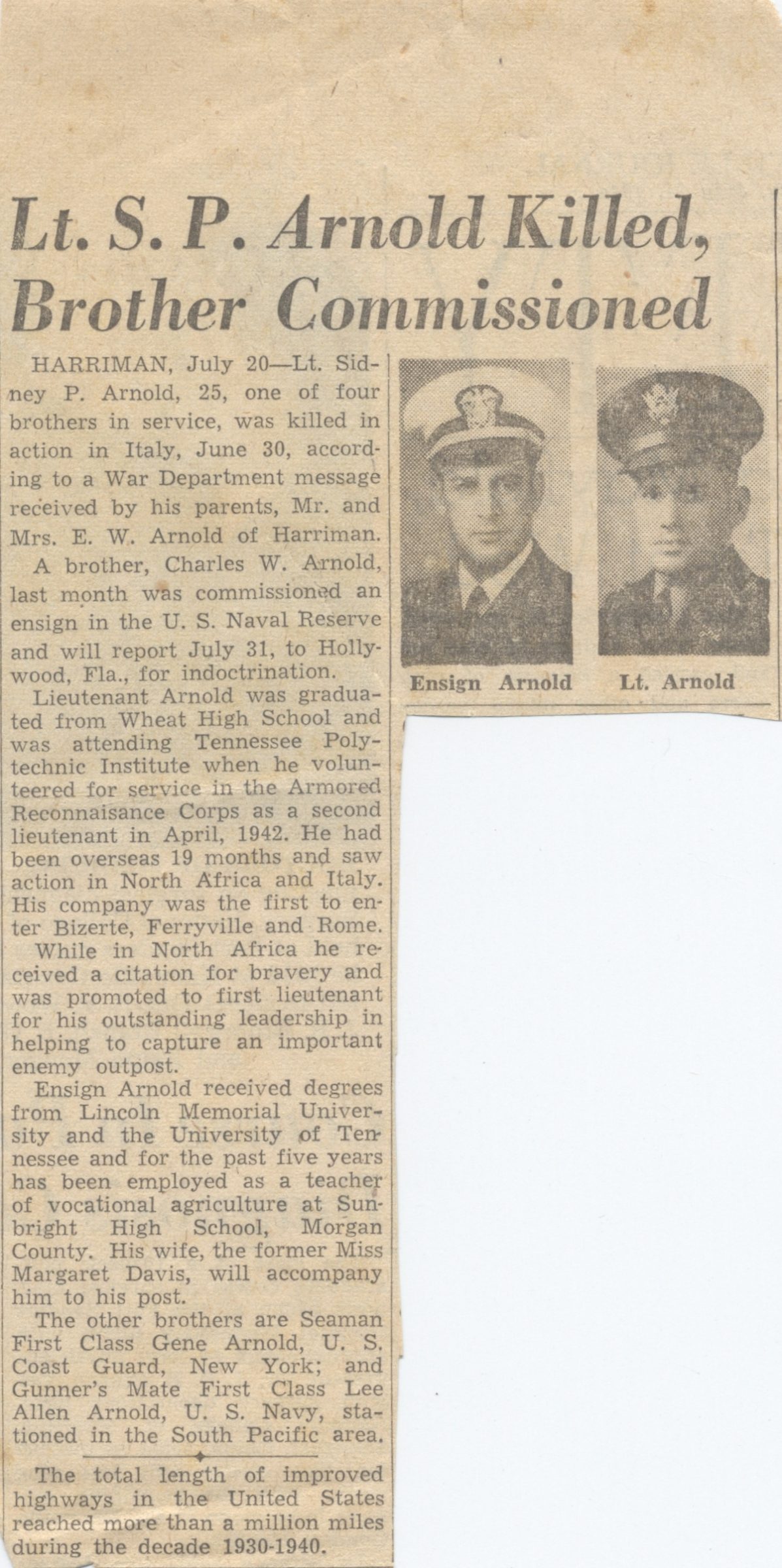 Lieutenant Arnold was graduated from Wheat High School and was attending Tennessee Polytechnic Institute when he volunteered for service in the Armored Reconnaissance Corps in April 1942. He had been overseas for 19 months and had seen action in North Africa and Italy. His company was the first to enter Bizerte, Ferryville, and Rome.