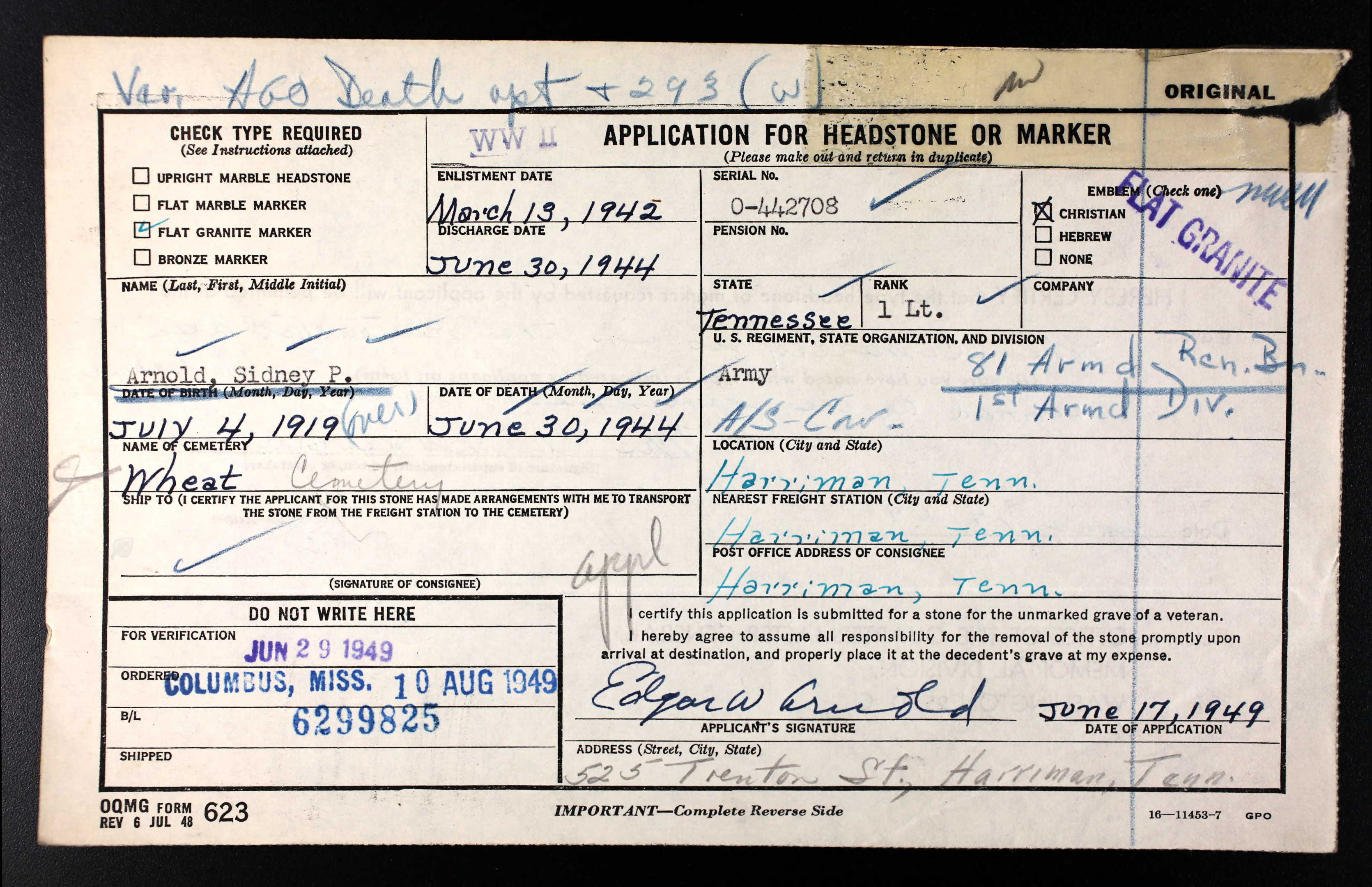 Arnold fell in action against a German tank in Italy on June 30, 1944.