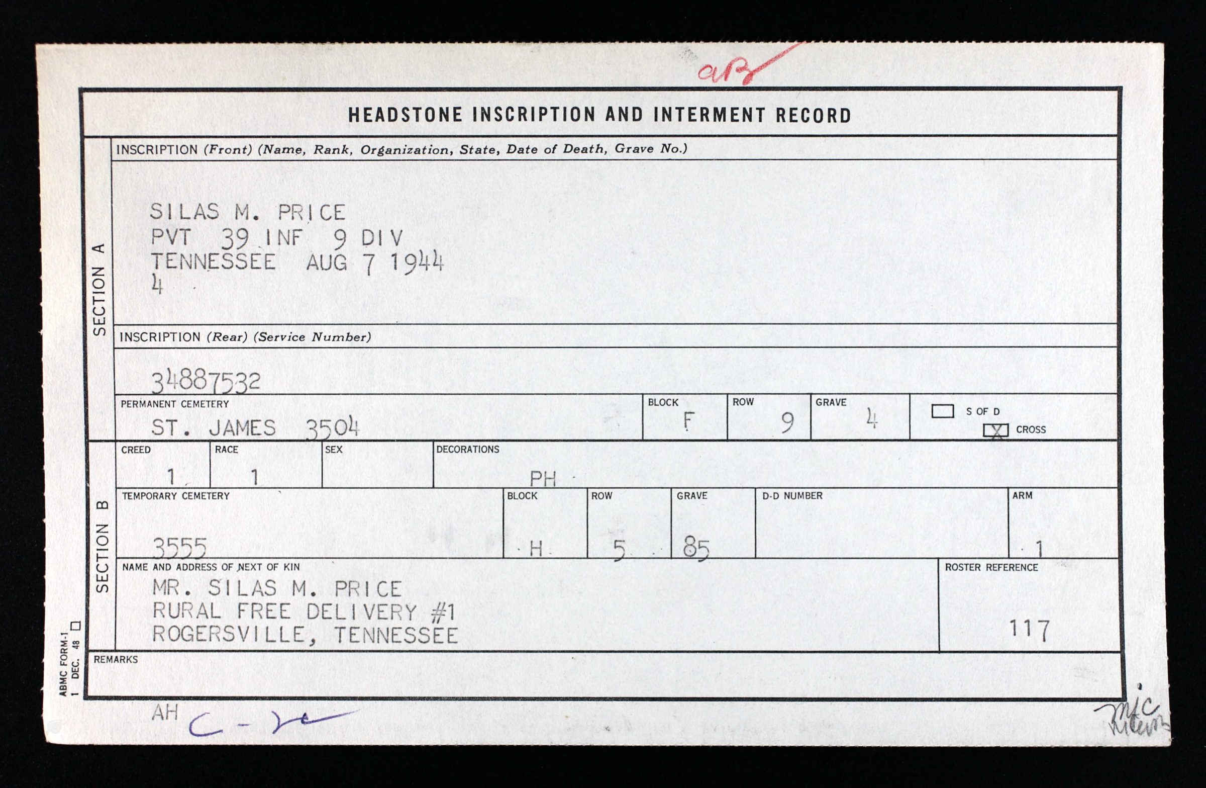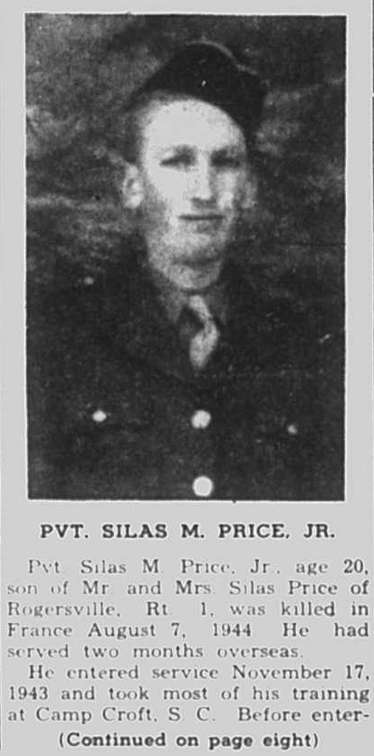Pvt. Silas M. Price Jr., age 20, son of Mr. and Mrs. Silas Price of Rogersville, Rt. 1, was killed in France August 7, 1944. He had served two months overseas. He entered service November 17, 1943 and took most of his training at Camp Croft, S.C. Before entering service, he was employed at Baltimore, Md. He was a member of the Choptack church. He is survived by his parents, 5 sisters, Mrs. Arthur Bulock, New Haven, Conn., Eloise, Mary Lou, Delois and Marie, all of Rogersville; 2 brothers, Pvt. Pierce Price of Alabama and Clarence of Kingsport. His father is a veteran of the first World war.