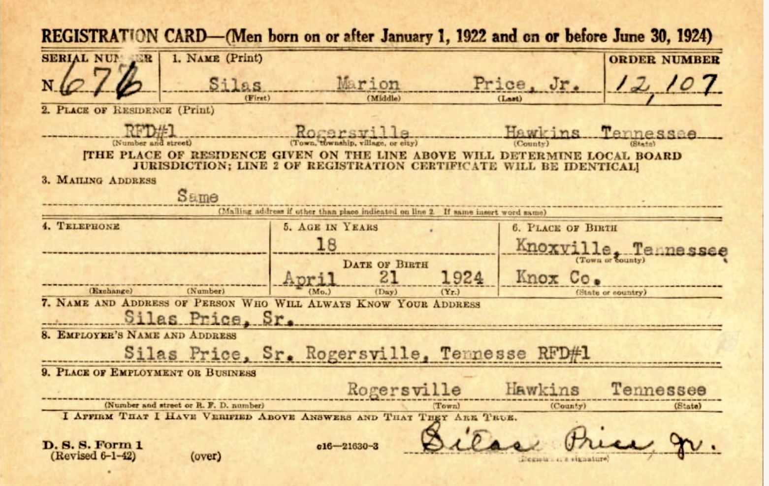 Silas Marion Price Jr. was the son of Silas Marion Price and Mary Livia Russell. He was born in 1924 in Rogersville, Hawkins County, Tennessee, and was a Private.
