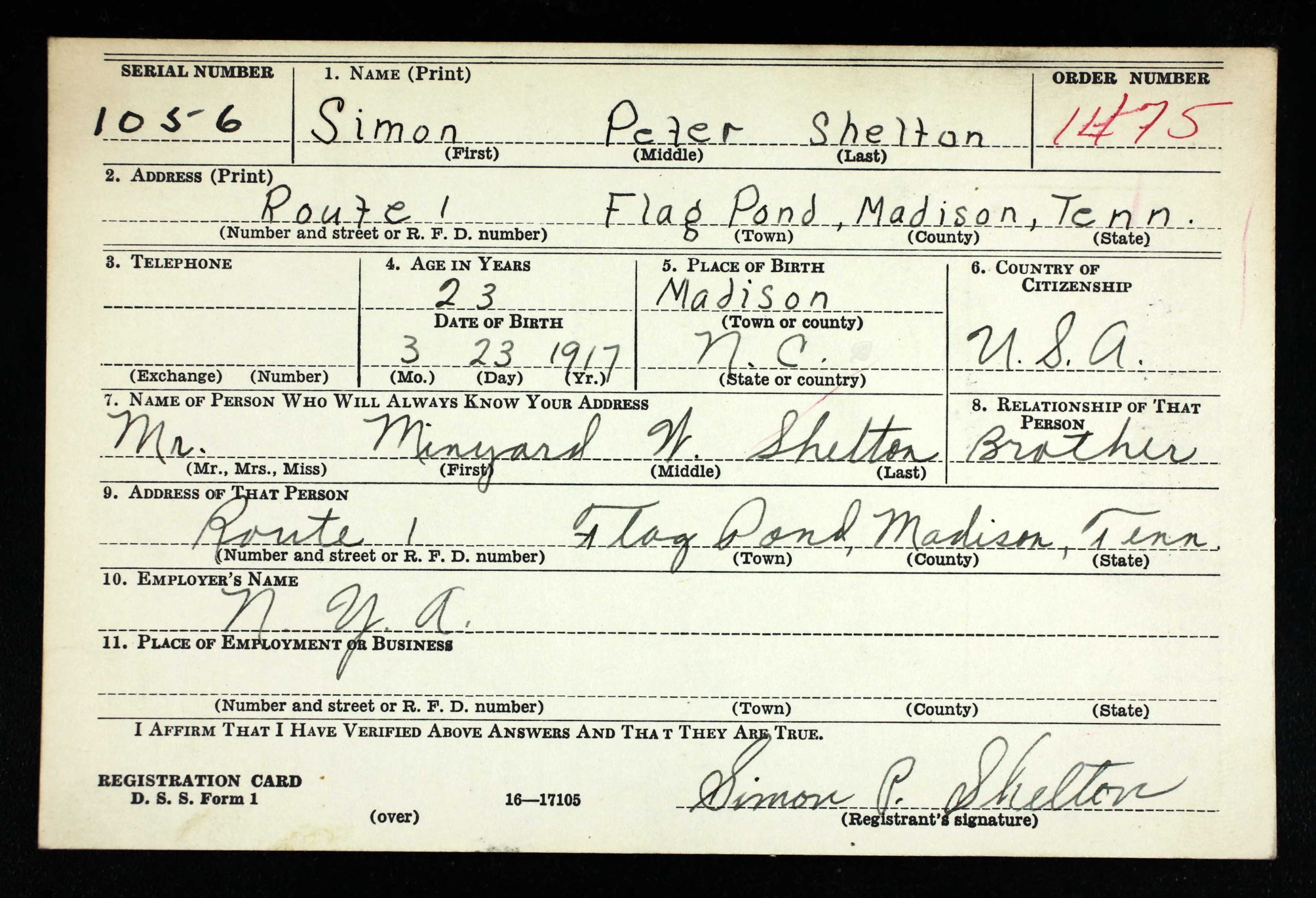 Simon Peter Shelton was born on 23 March 1917 in Madison, North Carolina. He was the son of Peter Sylvanie “Pete” Shelton and Daisy Ray. Twin brother of Peter Shelton.