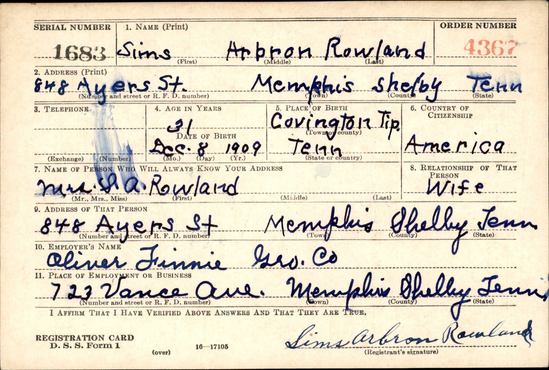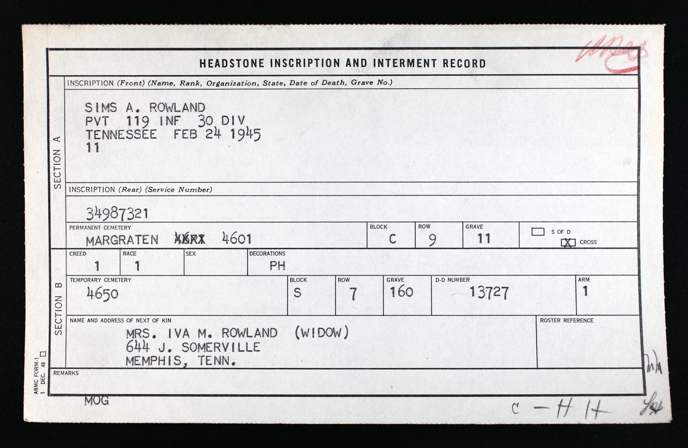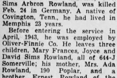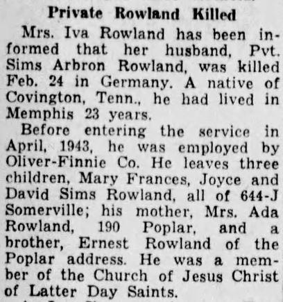 Mrs. Iva Rowland has been informed that her husband, Pvt. Sims Arbron Rowland, was killed Feb. 24 in Germany. A native of Covington, Tenn., he had lived in Memphis 23 years. Before entering the service in April 1943, he was employed by Oliver-Finnie Co. He leave three children, Mary Frances, Joyce and Davis Sims Rowland, all of 644-J Somerville; his mother, Mrs. Ada Rowland, 190 Poplar, and a brother, Ernest Rowland of the Poplar address. He was a member of the church of Jesus Christ of Latter Day Saints.