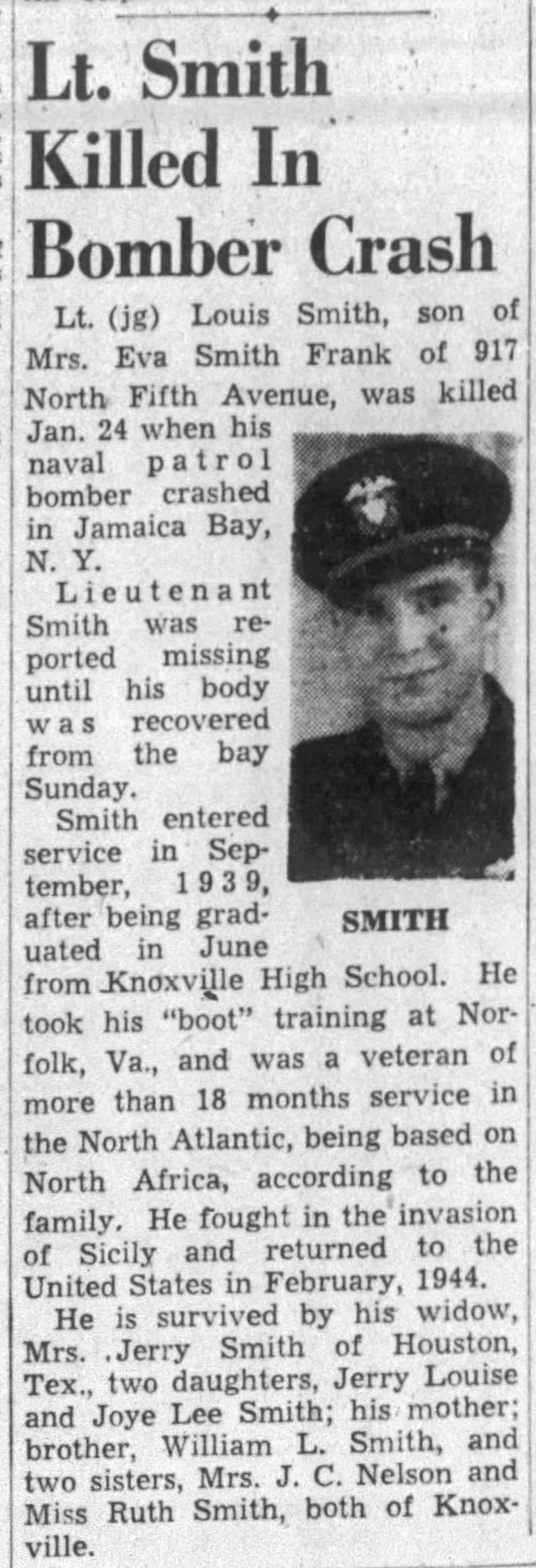 Lt. (jg) Louis E. Smith, 26, son of Mrs. Eva Smith Frank, 917 North Fifth Avenue, was reported missing after a patrol bomber crashed into Jamaica Bay, N.Y. last Wednesday morning. A graduate of Knoxville High School before joining the Navy in 1939, Lt. Smith spent 18 months overseas. He had served somewhere in the North Atlantic. His wife, Mrs. Louis E. Smith, lives in Brooklyn, N.Y. No details of the plane’s crash has been disclosed to the family. Three men perished in the crash and five were rescued slightly injured.