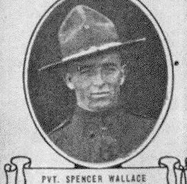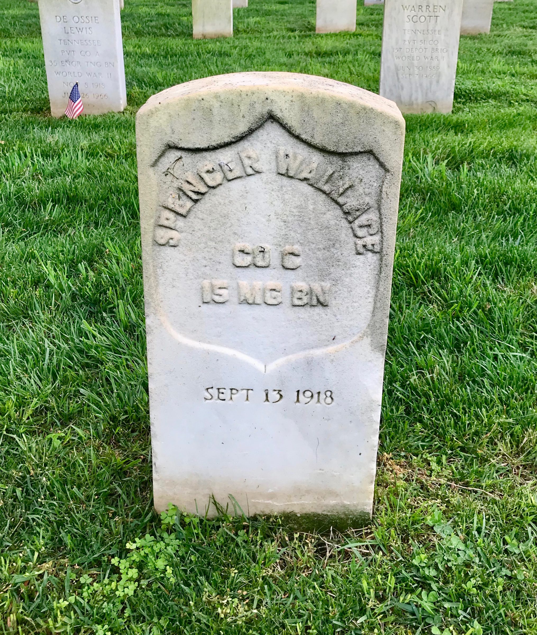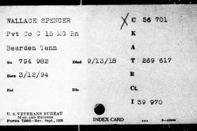 Spencer Wallace entered the service of the U.S. Army on September 21, 1917. Assigned to Company A, 328th Infantry and prior to sailing for France in April 1918 saw service at the following camps: Camp Gordon, GA, Camp Jackson, SC, and Fort Oglethorpe, GA. Private Wallace was killed in action on September 13, 1918, in the Argonne Forest, as a member of Company C, 15th Machine Gun Battalion, to which he had transferred.