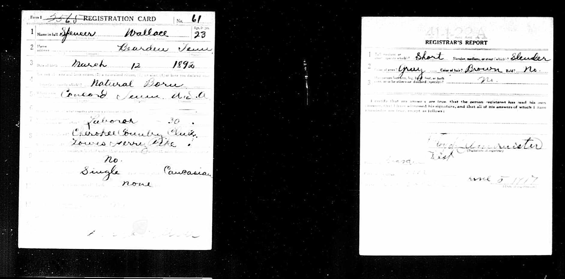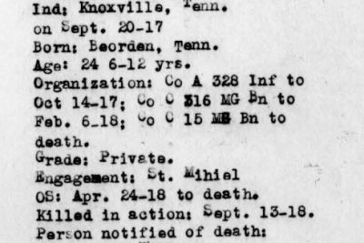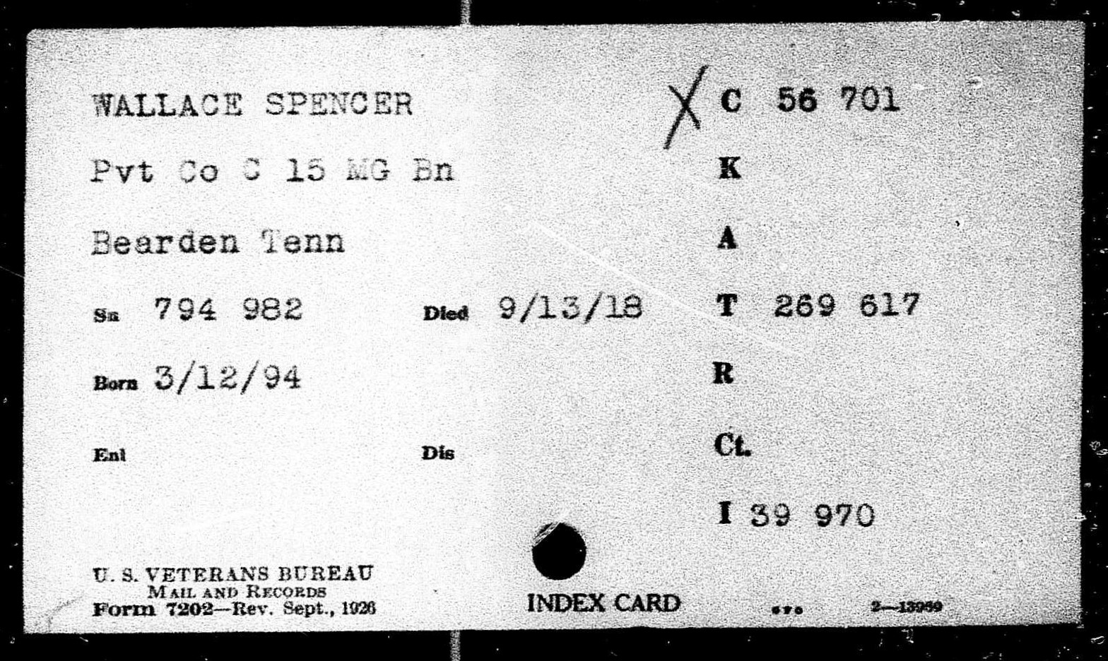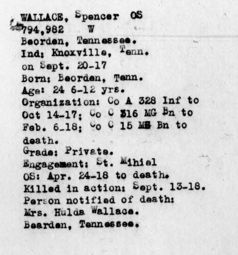 “Official confirmation of the death of Spence Wallace, aged 22 who was killed in action in France, September 1, has been received through the government casualty list. Young Wallace was a son of Lige Wallace and the first man from the Bearden community to be killed in France. A gold star will be placed in the community service flag in honor of his memory.”