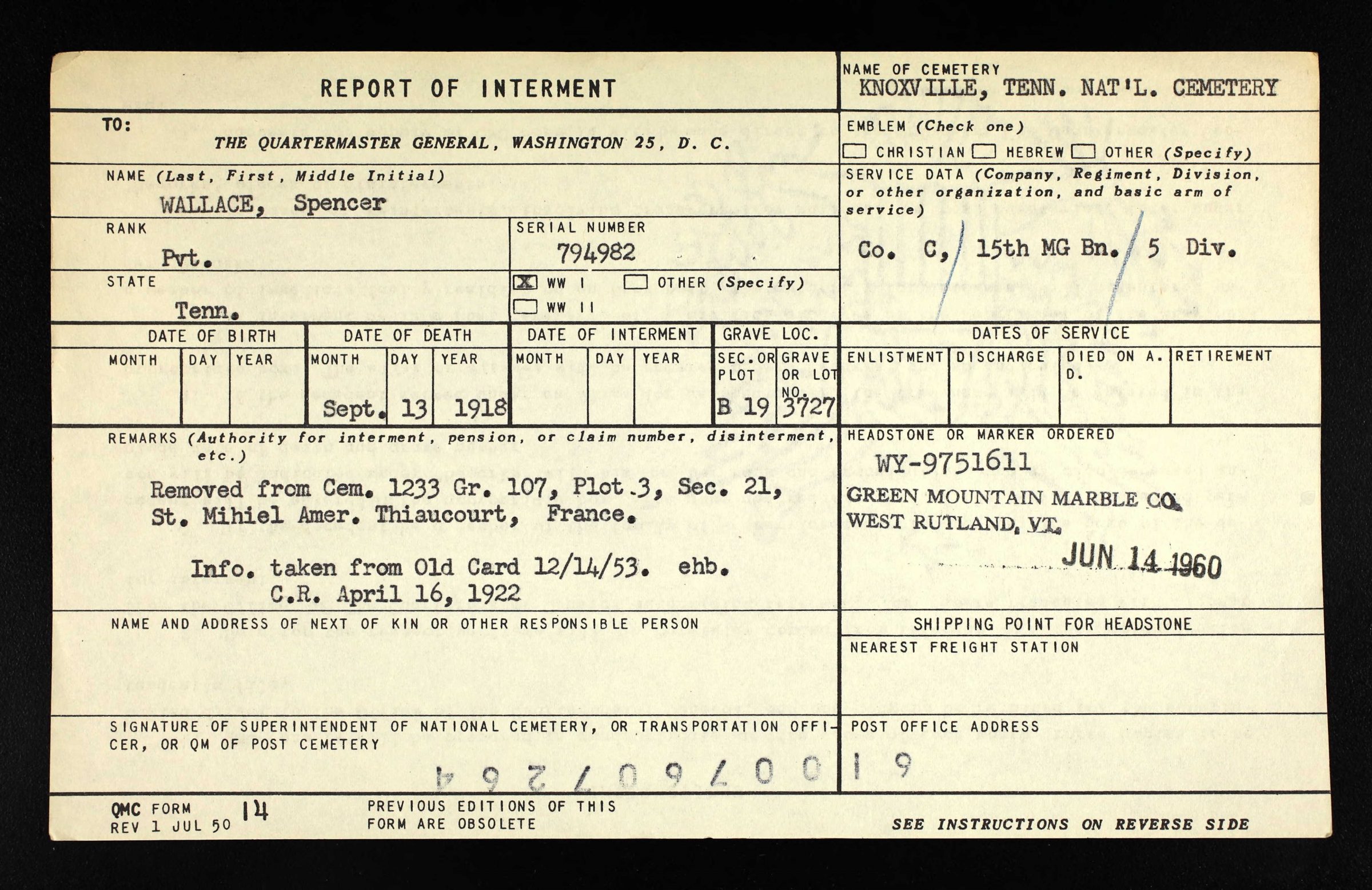 Spence Wallace was returned to the United States and was buried at the Knoxville National Cemetery.