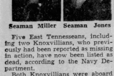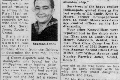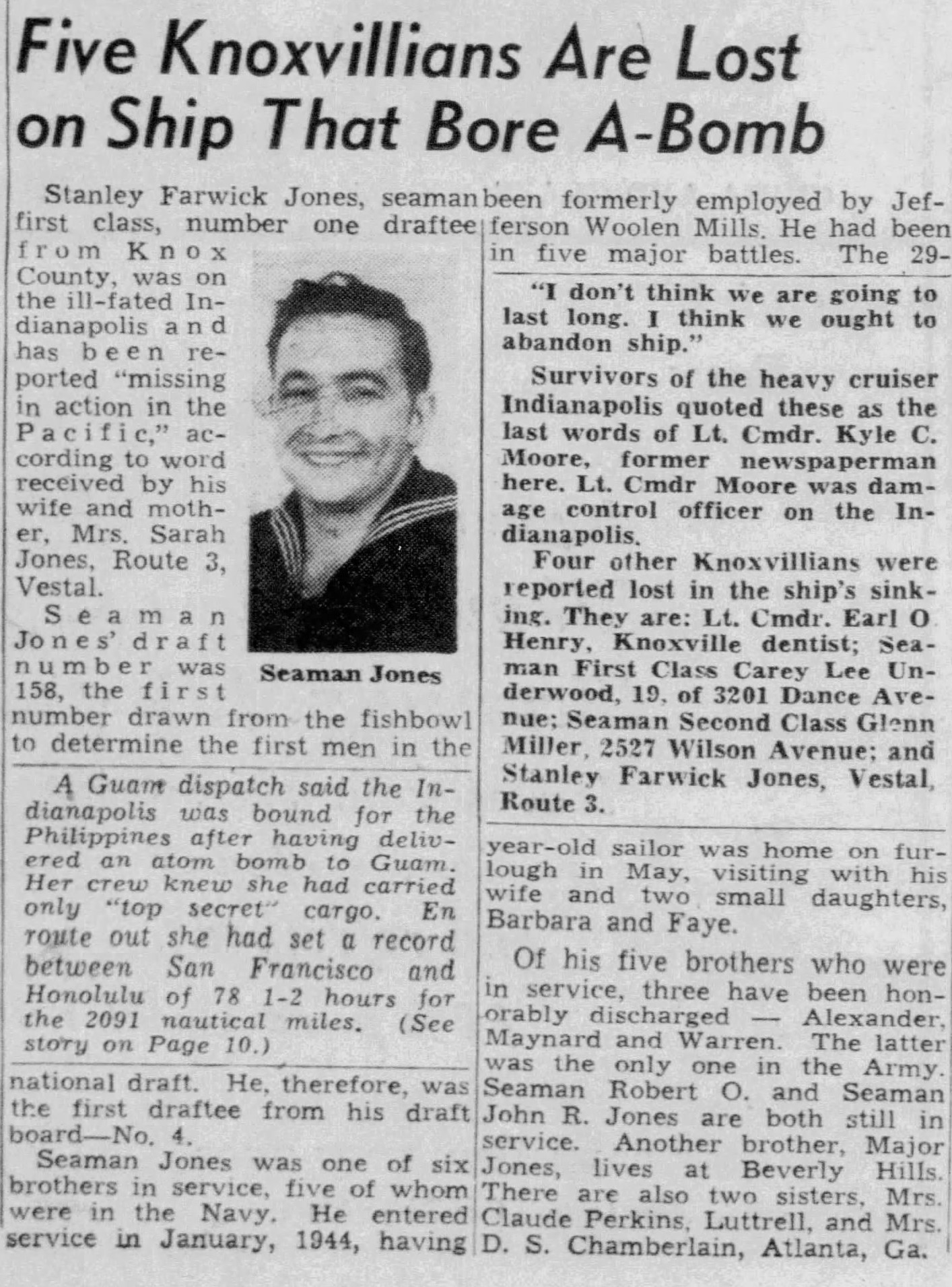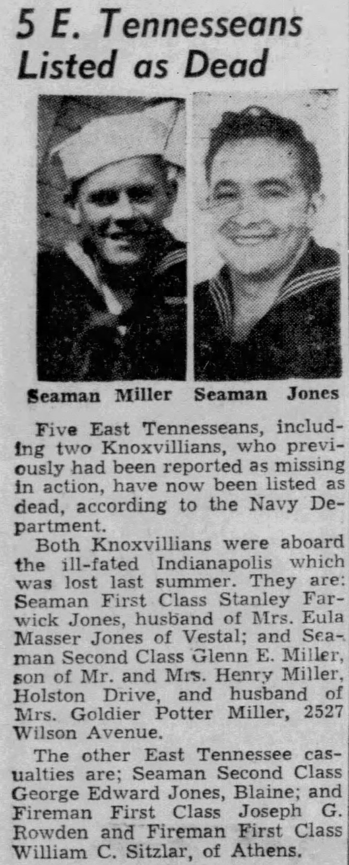 Two Knoxvilllians were aboard the ill-fated Indianapolis which was lost last summer. They are: Seaman First Class Stanley Farwick Jones, husband of Mrs. Eula Masser Jones of Vestal; and Seaman Second Class Glenn E. Miller, son of Mr. and Mrs Henry Miller, Holston Drive, and husband of Mrs. Goldier Potter Miller, 2527 Wilson Avenue.