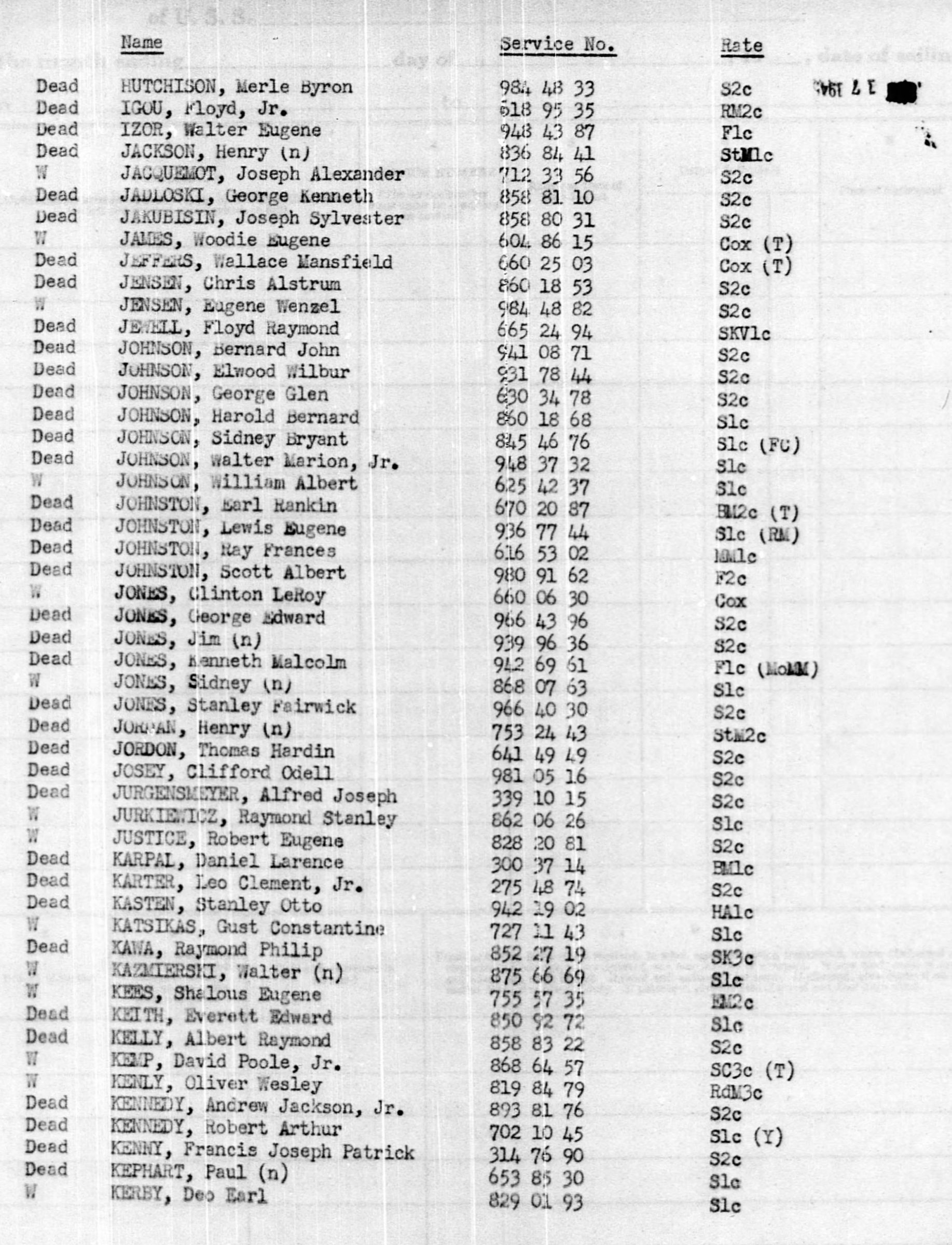 Stanley Farwick Jones, seaman first class, number one draftee from Knox County, was on the ill-fated Indianapolis and has been reported “missing in action in the Pacific,” according to word received by his wife and mother, Mrs. Sarah Jones, Route 3, Vestal. Seaman Jones draft number was 158, the first number drawn from the fishbowl to determine the first men in the national draft. He, therefore, was the first draftee from his draft board – No. 4. Seaman Jones was one of six brothers in service, five of whom were in the Navy. He entered service in January, 1944, having been formerly employed by Jefferson Woolen Mills. He had been in five major battles. The 29-year old sailor was home on furlough in May, visiting with his wife and two small daughters, Barbara and Faye.