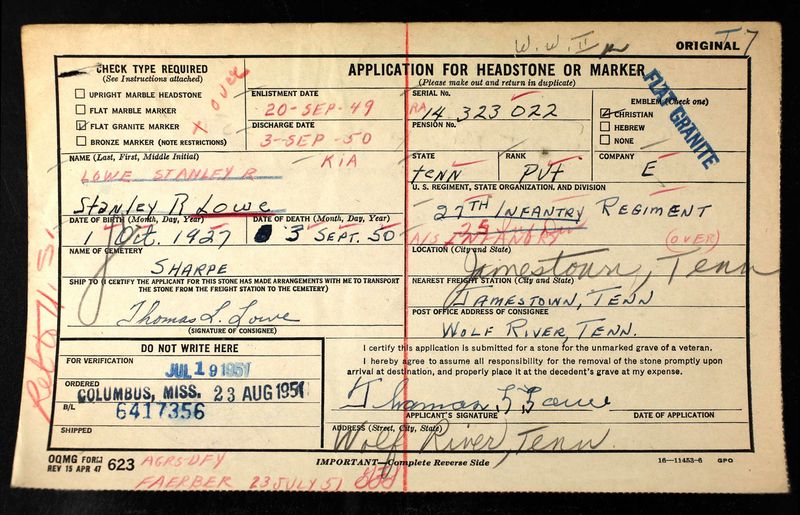 Private Lowe was a member of the 27th Infantry Regiment, 25th Infantry Division. He was Killed in Action while fighting the enemy in South Korea.