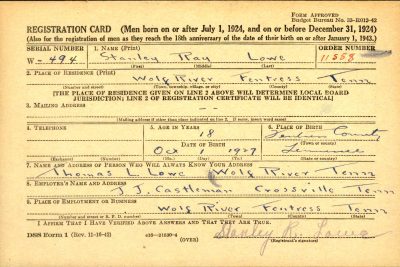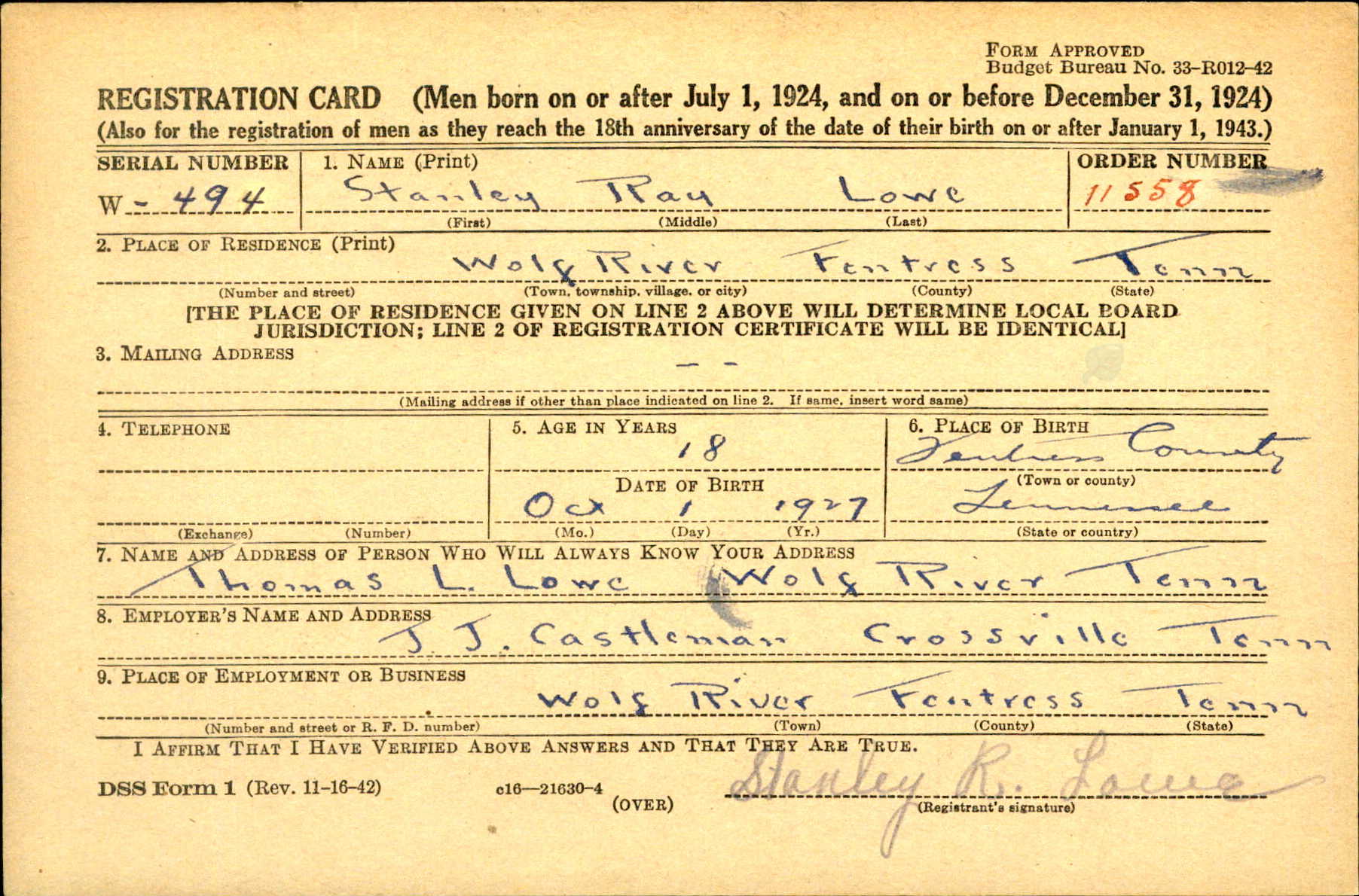 Stanley Ray Lowe was born in Wolf River, Fentress, Tennessee to Thomas Lafayette Lowe and Mary Elvira Hoover.