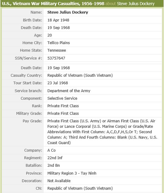 Today I sat in a class room like the one that Stevie and I sat in. But I think of the years that have passed since we sat together in class I still miss him he was a special person. I love him and I love his family. Many have now gone to be with him now. I thank him and his family for all he gave and I hope other people will realize just what much we are in debt to these brave young men who died for us. Again thank you. I will never forget you Stevie Dockery.