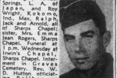 Private Stiner (Steiner) Wright was the son of Mr. and Mrs. Otis Wright of Sharps Chapel. In addition to his parents he was survived by brothers, J.C. Wright, L.A. Wright, Roy, Max, Ralph, Jack, and Arnold Wright and sister, Mrs. Emma Jean Rogers.
