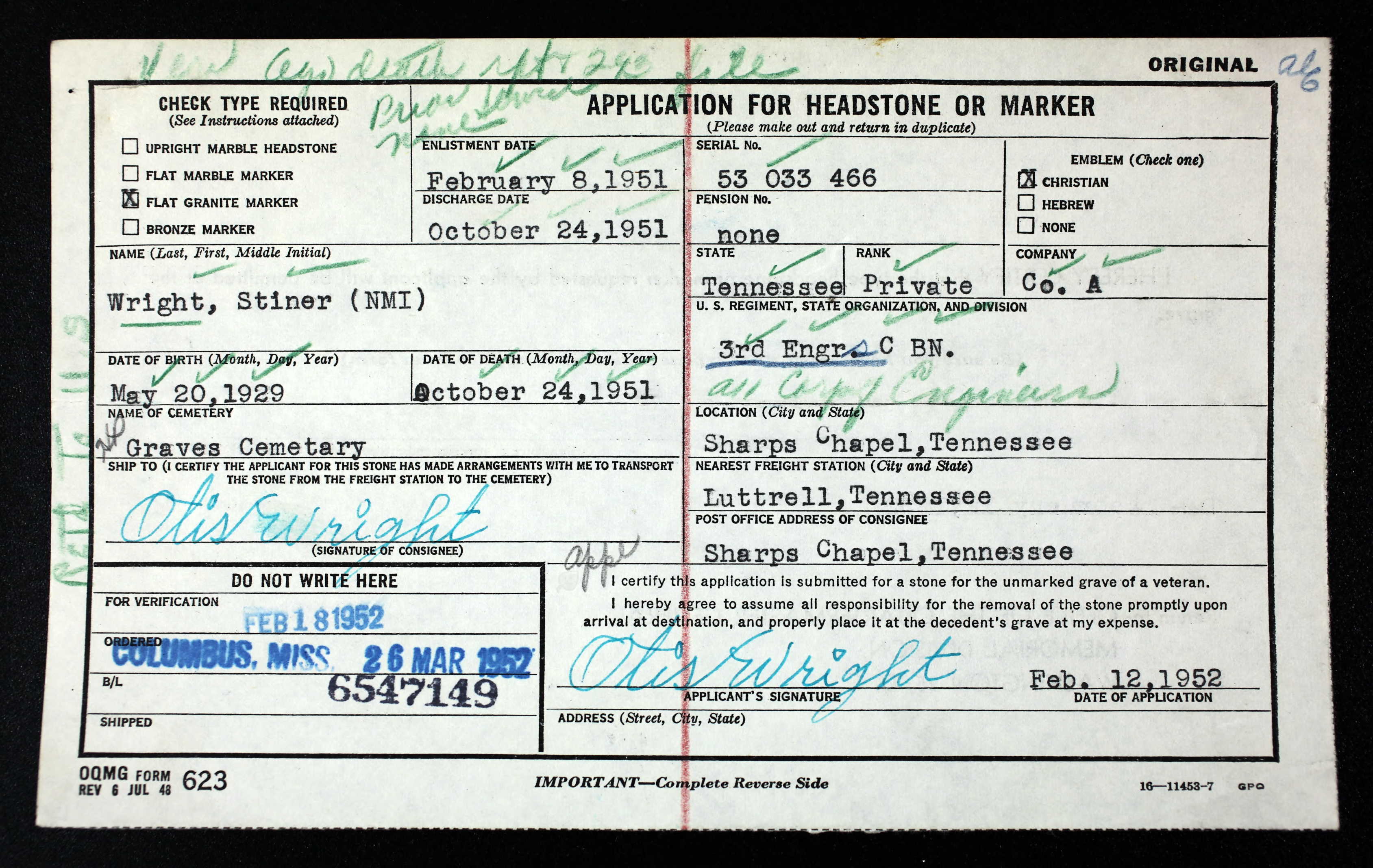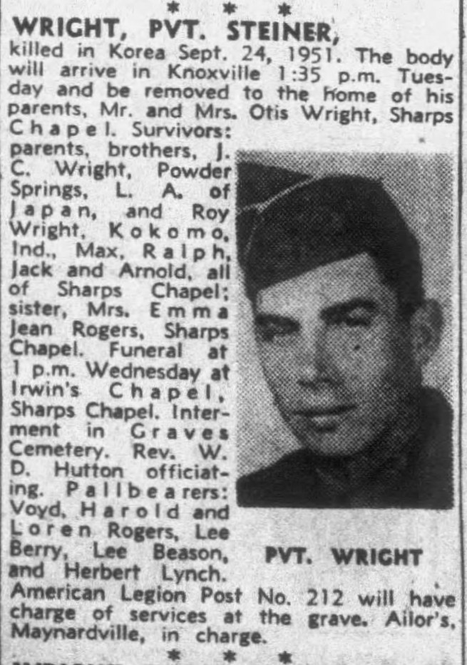 Pvt. Steiner Wright, killed in Korea, Sept. 24, 1951. The body will arrive in Knoxville and be removed tot he home of his parents, Mr. and Mrs. Otis Wright, Sharps Chapel. Survivors: parents, brothers, J.C. Wright, Powder Springs, L.A. Wright of Japan, and Roy Wright, Kokomo, Ind., Max, Ralph, Jack and Arnold, all of Sharps Chapel; sister, Mrs. Emma Jean Rogers, Sharps Chapel.