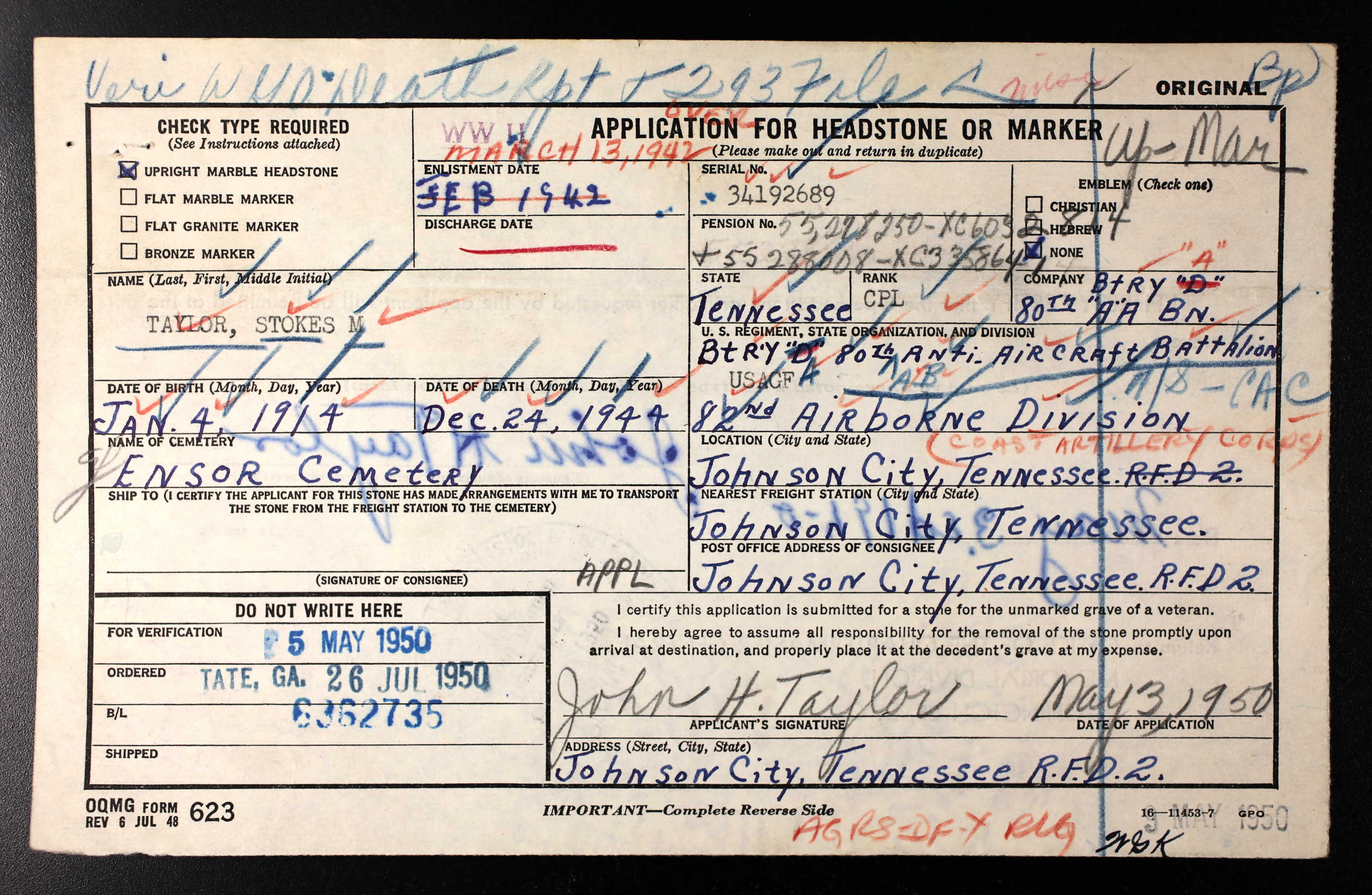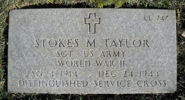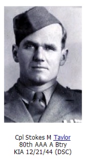 The President of the United States of America, authorized by Act of Congress, July 9, 1918, takes pleasure in presenting the Distinguished Service Cross to Corporal Stokes M. Taylor ASN 31192689, United States Army, for extraordinary heroism in connection with military operations against an armed enemy while serving with the 80th Airborne Anti-Aircraft Battalion, Parachute Infantry Regiment, 82d Airborne Division, in action against enemy forces on 21 December 1944, near Trois Ponts, Belgium. Corporal Taylor’s anti-tank squad was in position on a hill covering the road leading into Trois Ponts, Belgium. At approximately 1400 hours on 21 December 1944, the enemy launched a savage attack against the hill. Corporal Taylor’s gun was put out of action by enemy fire during this enemy advance. Seizing a Browning Automatic Rifle and ammunition, Corporal Taylor ordered his men to fall back, while he took up a position on the road and covered their withdrawal by fire. With complete disregard for his personal safety, and with full knowledge of the overwhelming odds against him, Corporal Taylor raked the hillside with intense and accurate fire which prevented the enemy from gaining the edge of the woods to fire on his anti-tank squad as they effected their withdrawal. After his ammunition was exhausted, Corporal Taylor was seen to be hit by enemy rifle fire. His unfailing courage and leadership were in keeping with the highest traditions of the United States Army and won the admiration and respect of all who witnessed his actions.