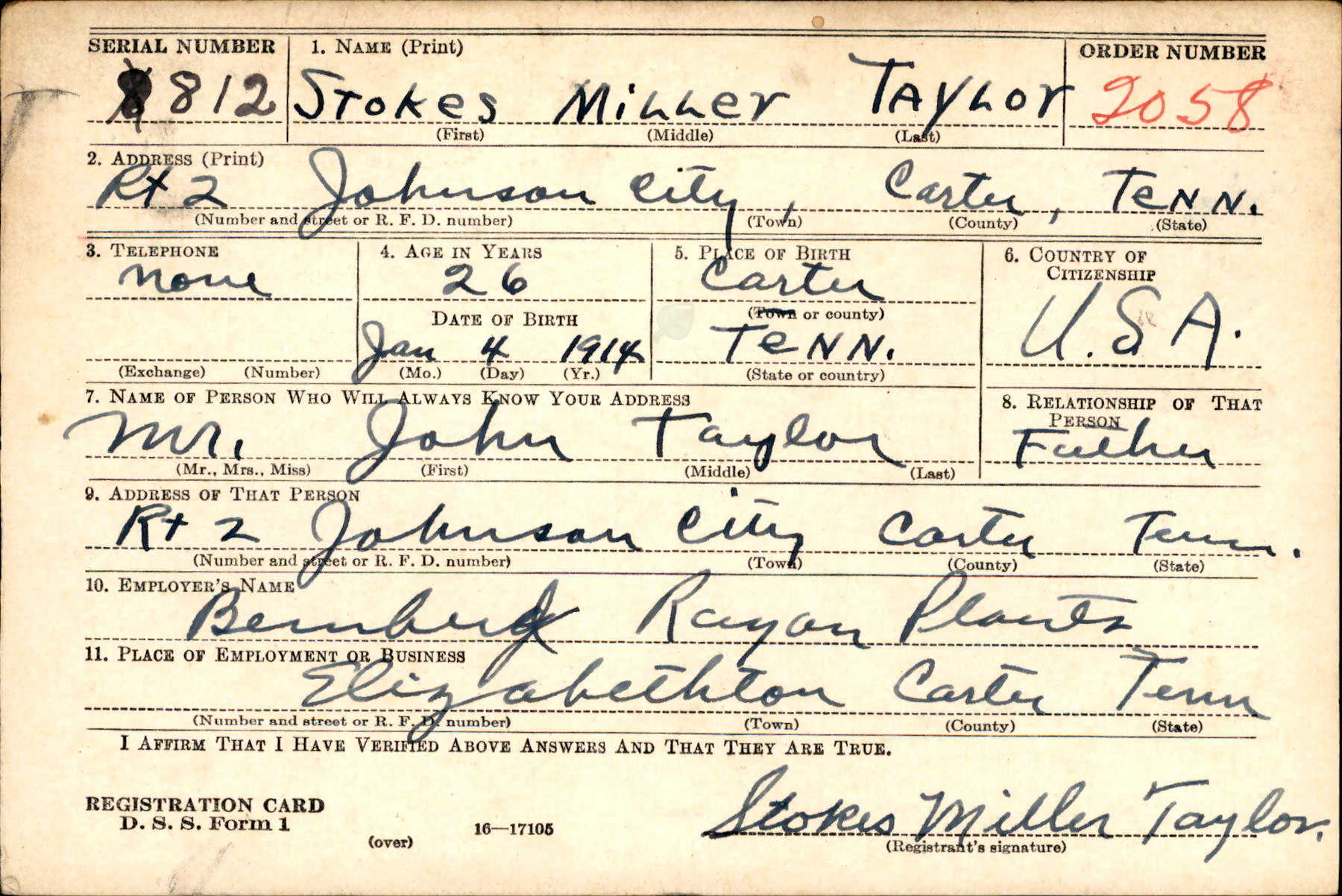 Stokes Miller Taylor was born on 4 January 1914, the son of John Hart Taylor and Lilly Arrowood. Husband of Lucy Bell Garland and father of Claude Eugene Taylor.