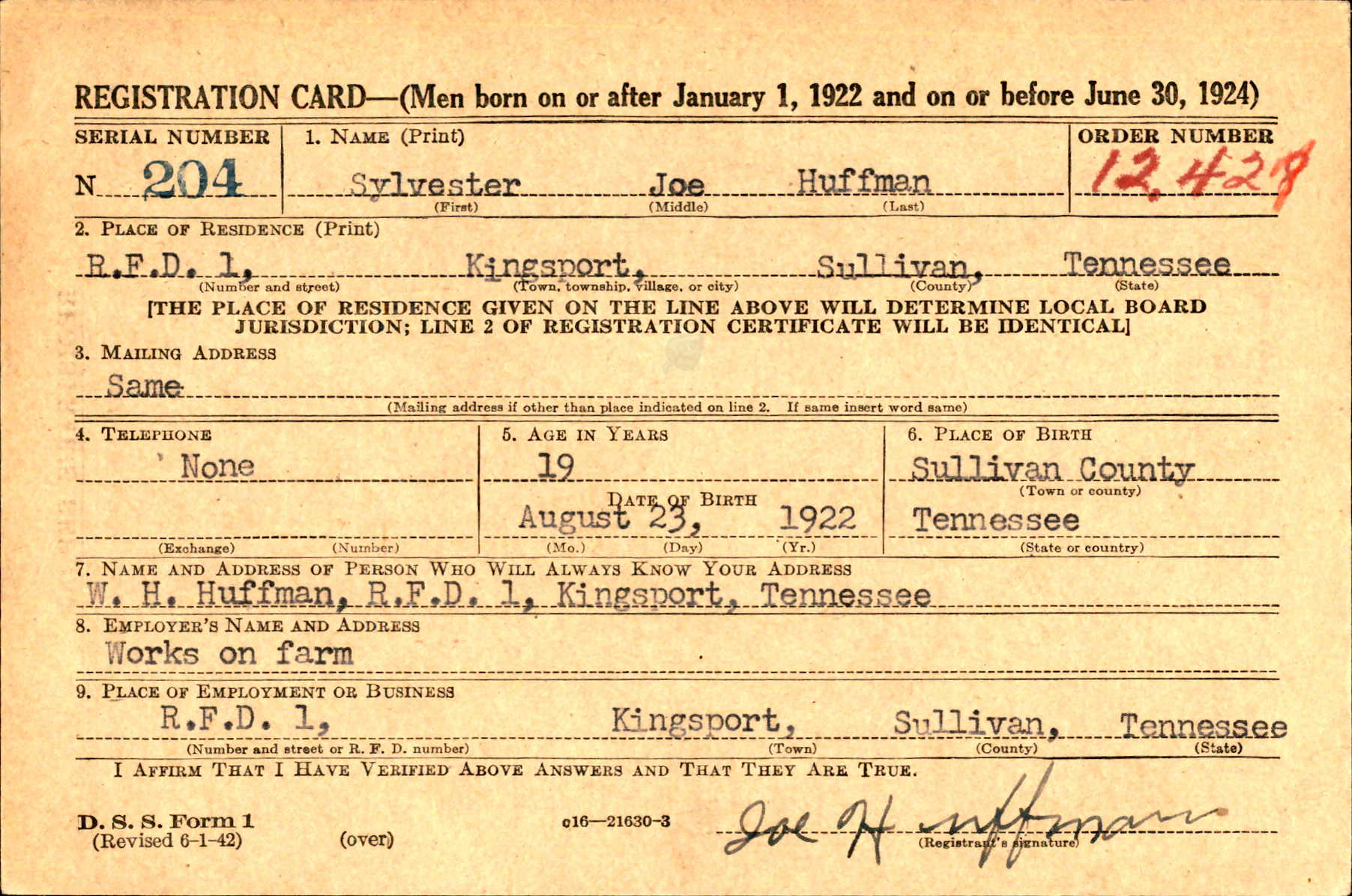 Sylvester Joe Huffman was born on 23 August 1922 in Sullivan County, TN. He was the son of William Henry Huffman and Frances “Fannie” Belle Caywood.