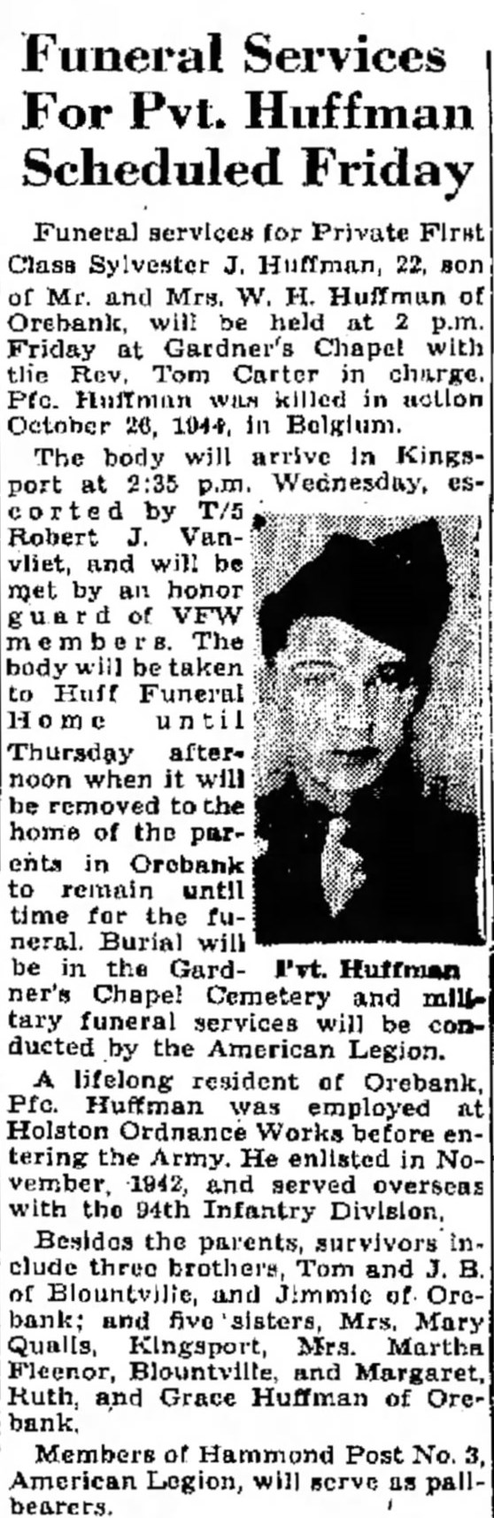 Funeral services for Private First Class Sylvester J. Huffman, 22, son of Mr. and Mrs W.H. Huffman of Orebank, will be held at 2 p.m. at Gardner’s Chapel with the Rev. Tom Carter in charge. PFC Huffman was killed in action October 26, 1944 in Belgium