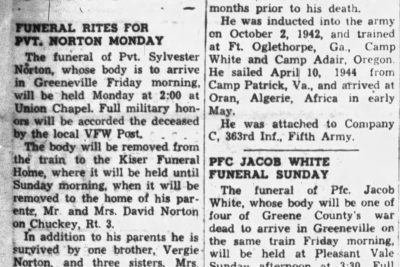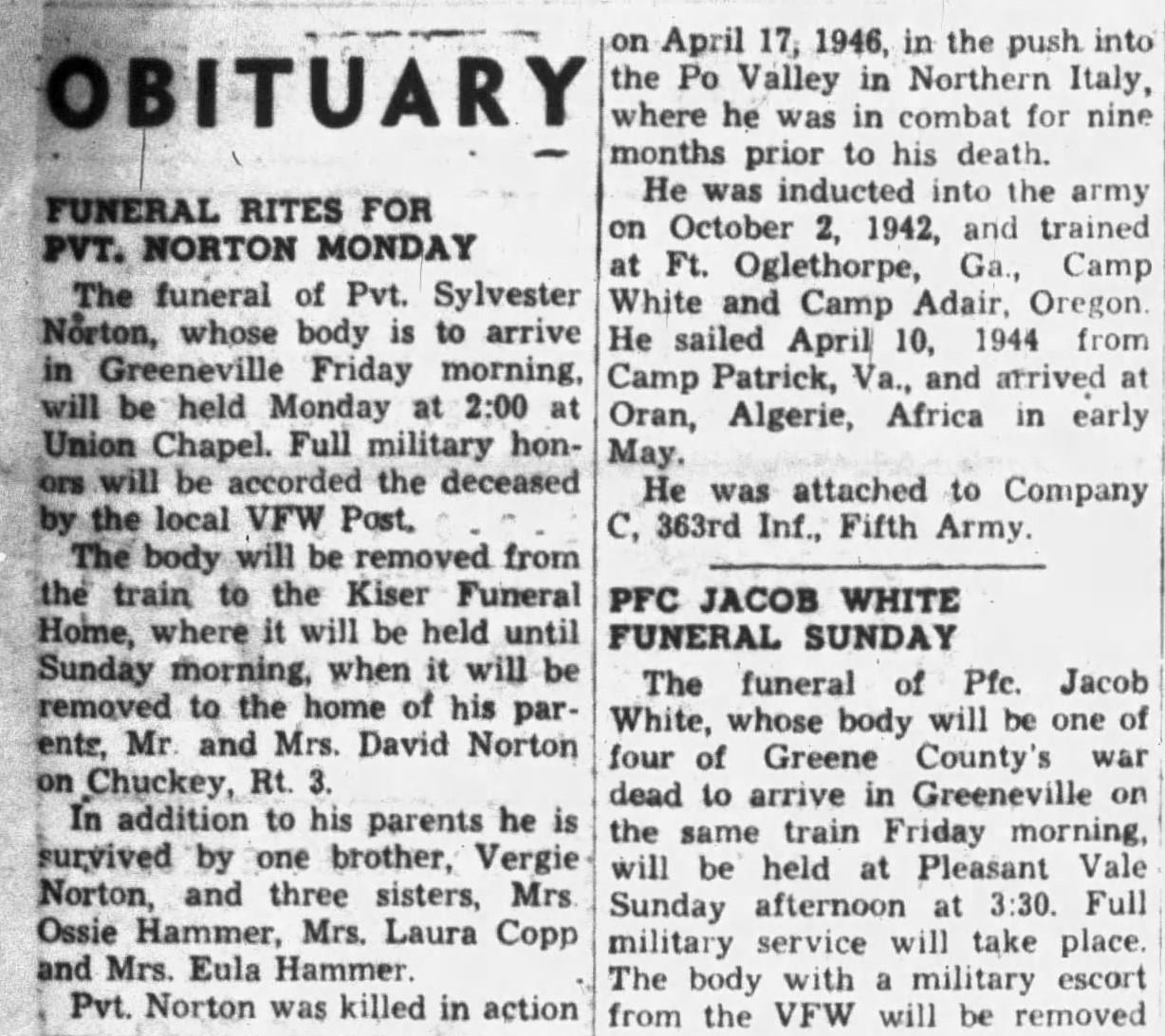 The funeral of Pvt. Sylvester Norton, whose body is to arrive in Greeneville will be held at Union Chapel. Full military honors will be accorded the deseased by the local VFW Post.