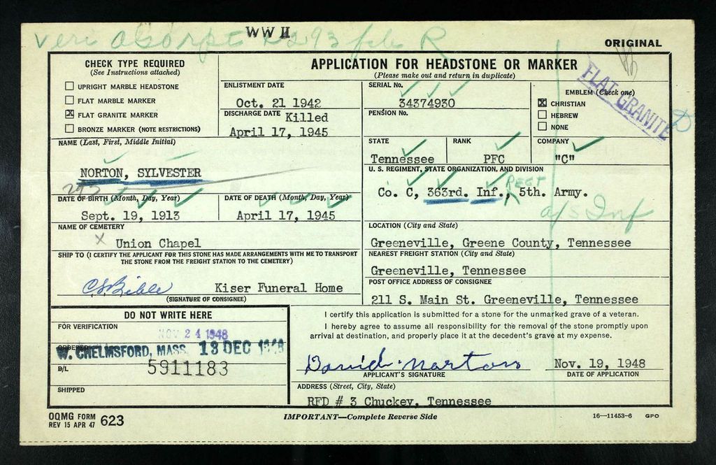 In addition to his parents, Mr. and mrs. David Norton of Chuckey, Rt. 3, he is survived by one brother, Vergie Norton, and three sisters, Mrs. Ossie Hammer, Mrs. Laura Copp and Mrs. Eula Hammer. Pvt. Norton was killed in action on April 17, 1945, in the push into the Po Valley in Northern Italy, where he was in combat for nine months prior to his death. He was inducted into the army on October 2, 1942, and trained at Ft. Oglethorpe, Ga., Camp white and Camp Adair, Oregon. He sailed April 10, 1944 from Camp Patrick, Va., and arrived at Oran, Algerie, Africa in early May. He was attached to Company C, 363rd Inf., Fifth Army.