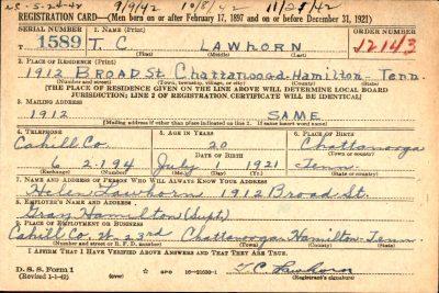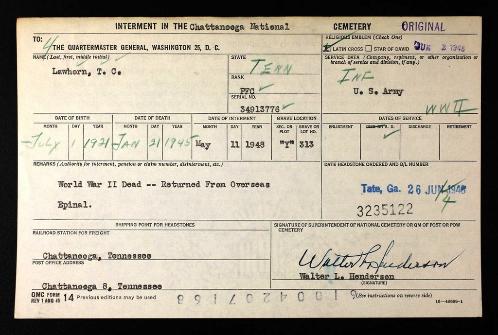 PFC Lawhorn was returned from Epinal, France. He is buried at the Chattanooga Memorial Cemetery, Y, 313.