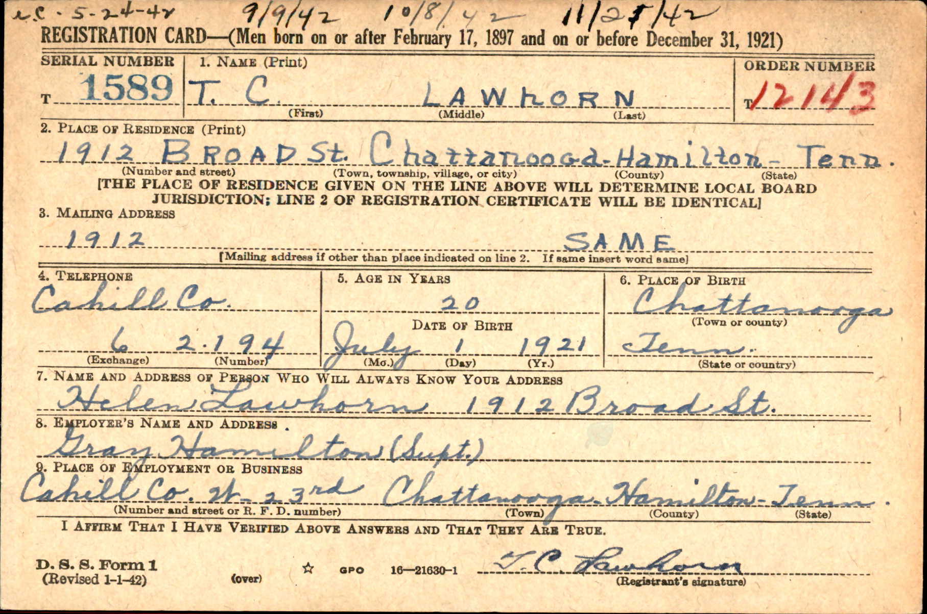 Thomas Clinton Lawhorn was born 1 July 1921, son of Thomas Clinton Lawhorn and Johnnie FrancisDickson. He was married to Helen LaDuke and was the father of Peggy Ann (3) and William Edward Lawhorn (2). Pfc Lawhorn was in the army since January, 1944 and received training in the infantry at Fort McClellan, Alabama, and went overseas in December, 1944. He was killed in action 21 January 1945 in France.