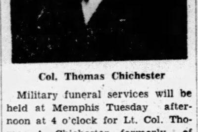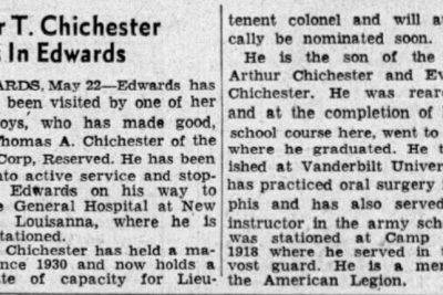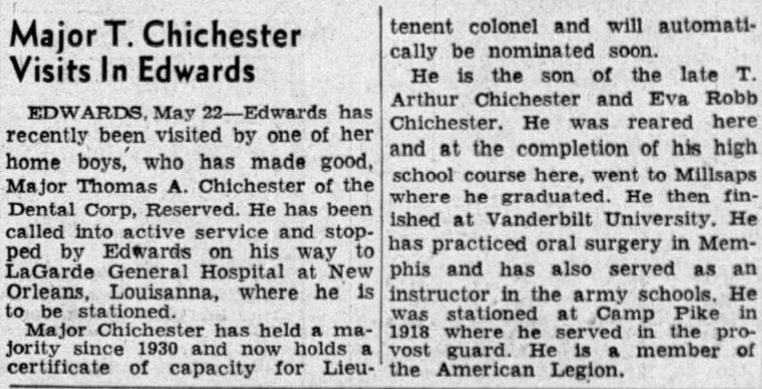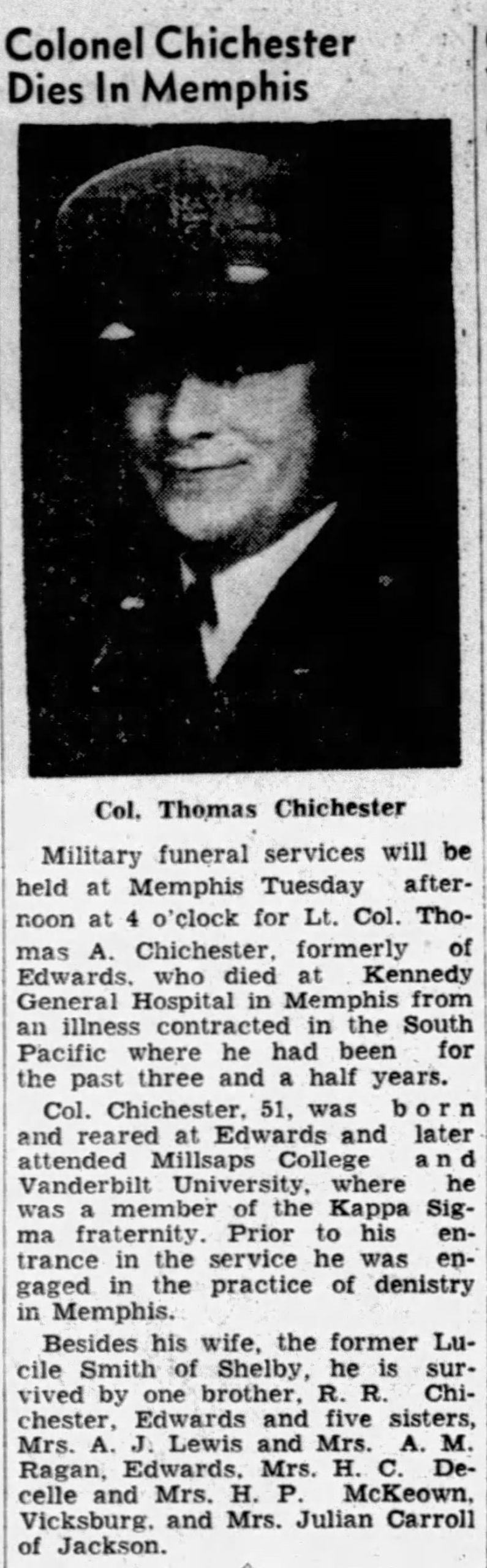 Military funeral services will be held at Memphis for Lt. Col. Thomas A. Chichester, formerly of Edwards, who died at Kennedy General Hospital in Memphis from an illness contracted in the South Pacific where he had been for the past three and a half years. Col. Chichester, 51, was born and reared at Edwards and later attended Millsaps College and Vanderbilt University, where he was a member of the Kappa Sigma fraternity. Prior to his entrance in the service he was engaged in the practice of denistry in Memphis. Besides his wife, the former Lucile Smith of Shelby, he is survived by one brother, R.R. Chichester, Edwards and five sisters, Mrs. A.J. Lewis and Mrs. A.M. Ragan, Edwards, Mrs. H.C. Decelle and Mrs. H.P. McKeown, Vicksburg, and Mrs. Julian Carroll of Jackson.