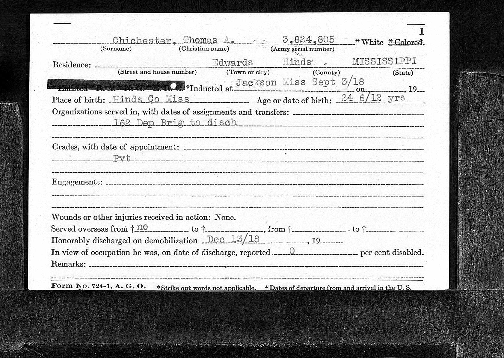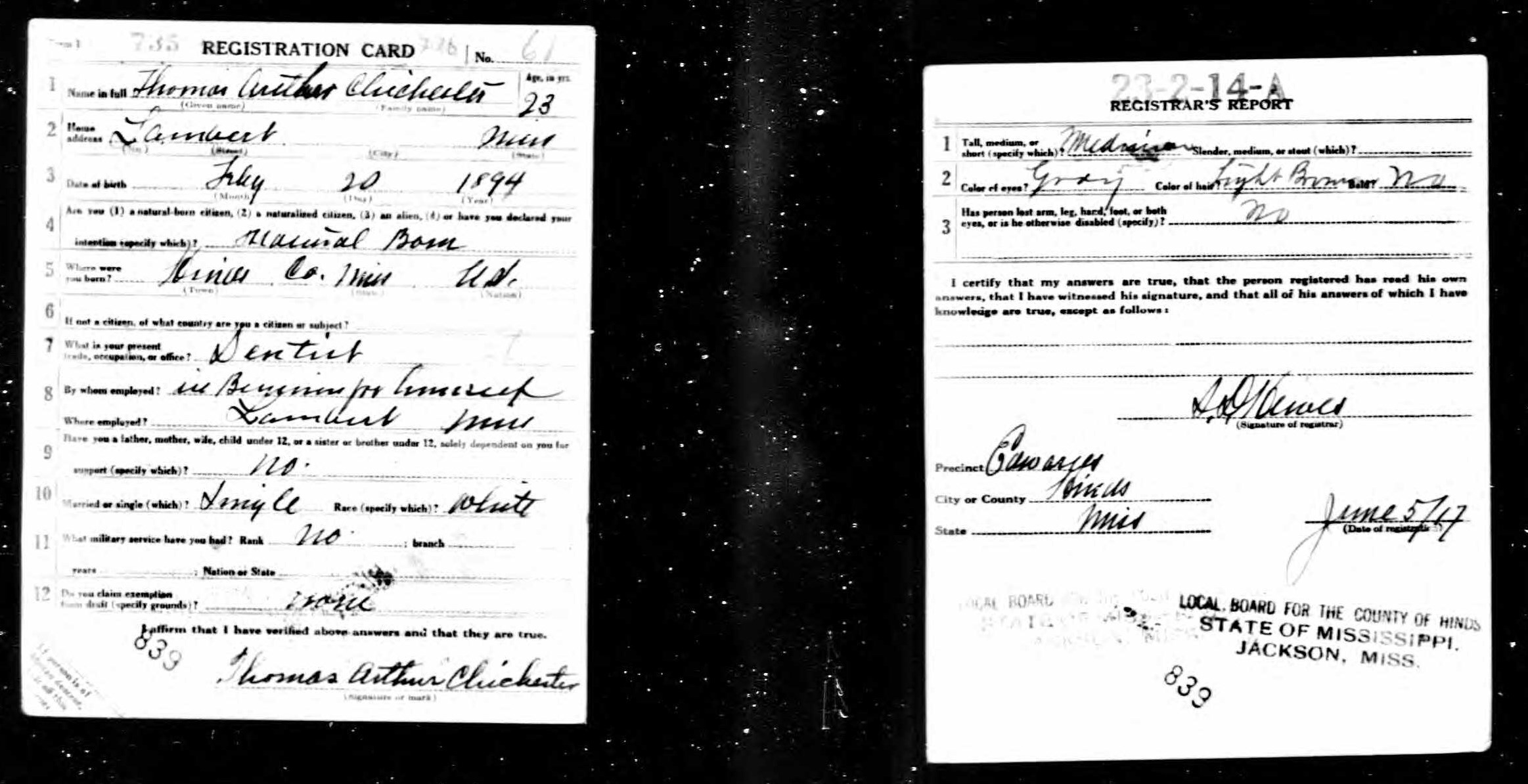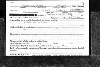 Thomas Arthur Chichester was born on 20 February 1894 at Edwards, Mississippi. Son of Thomas A and Evangeline Robb Chichester. Husband of Lucille S. Chichester.