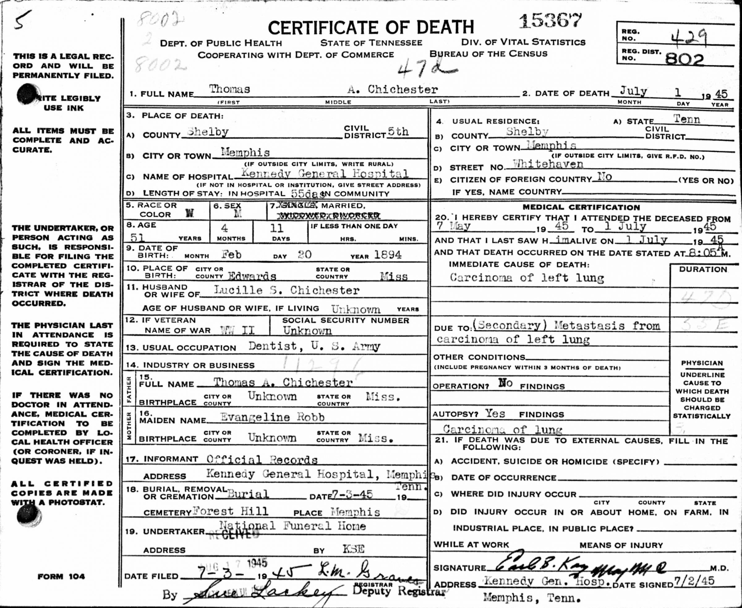 Lt. Col Chichester Died non Battle 1 July 1945 at the Kennedy General Hospital at Memphis due to (secondary) Metastasis from carcinoma of the left lung. He is buried at Forest Hill Cemetery, Memphis, TN