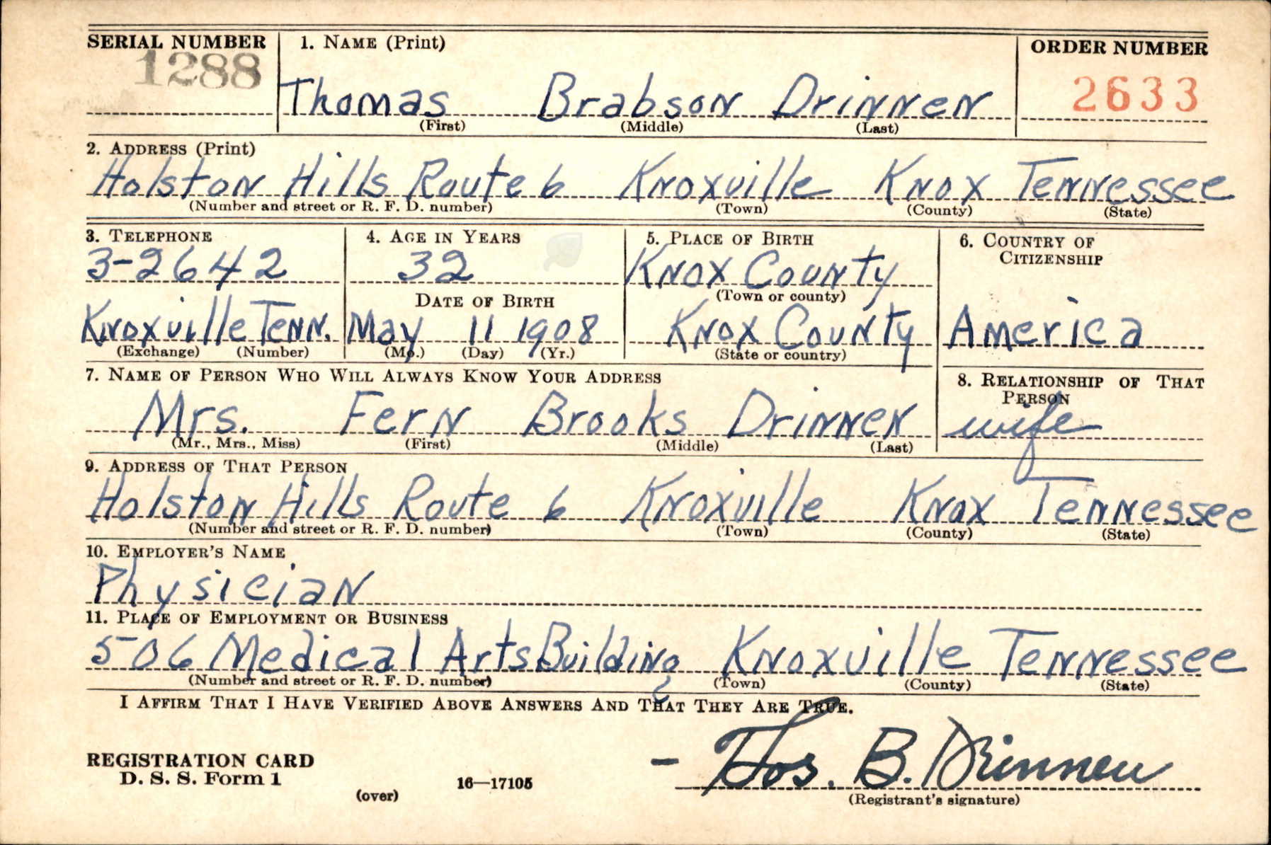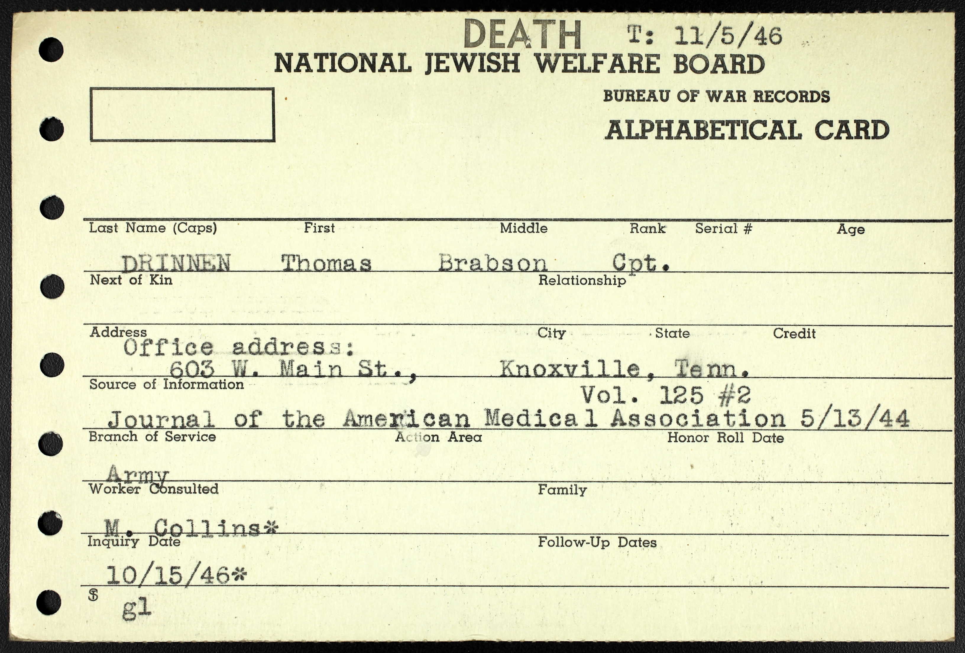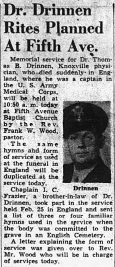 Thomas Brabson Drinnen was a medical doctor in Knoxville and entered the Army July 15, 1942. He trained at Ft. Rucker, Alabama and then moved to Memphis, Tennessee where he served with the 48th General Hospital unit at Kennedy General Hospital later Kennedy VA Hospital. His unit left for Europe in late December 1943 or early January 1944, a few months before D-Day. They stationed in Swindon, England. On February 24, 1944, Captain Drinnen was accidently killed by carbon monoxide from a water heater that was in the small metal barracks in which the unit lived. His body was interred in Swindon, England until after the war and then returned to Knoxville.