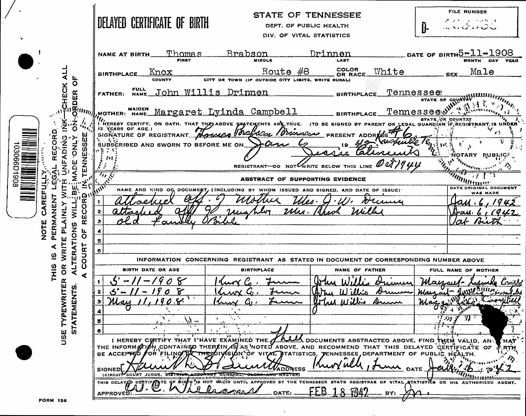 Thomas Brabson Drinnen was the son of John W. Drinnen and Lynn Campbell. He was married to Trula Fern Brooks.