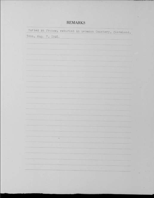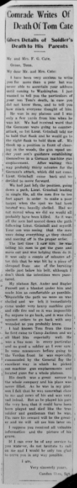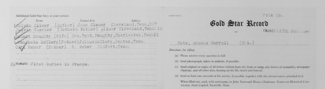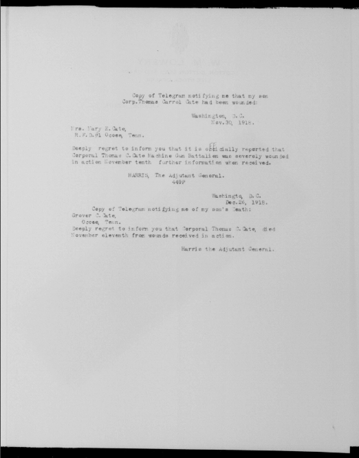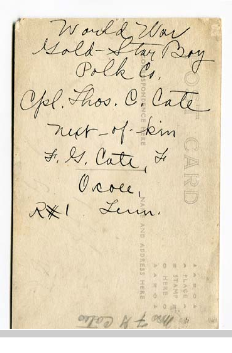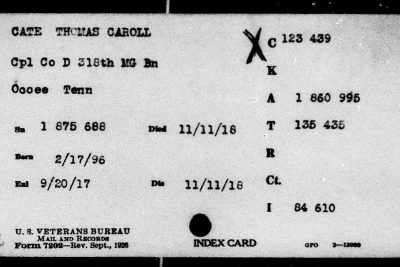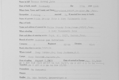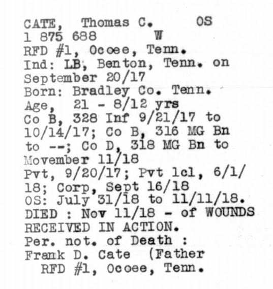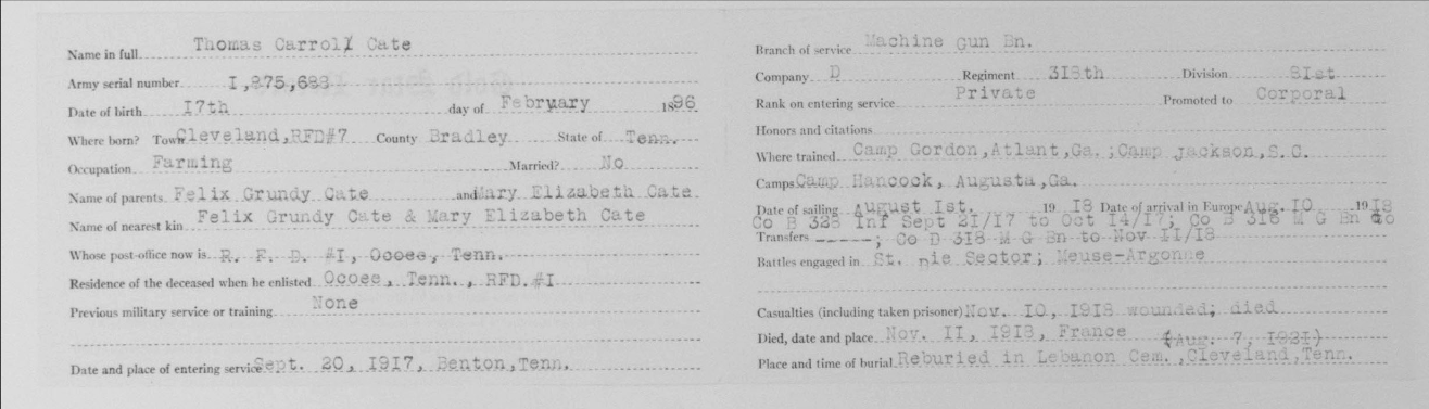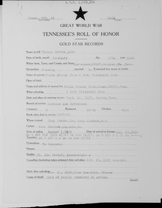 Thomas Carold (or Carroll) Cate was born 17 February 1896, Cleveland, Tennessee to Felix Grundy and Mary Elizabeth Cate. He entered the service on 20 September 1917 at Benton Tennessee and received his training at Camp Gordon in Atlanta, Georgia; Camp Jackson in South Carolina and Camp Hancock in Augusta, Georgia. He sailed to Europe on 1 August 1918, arriving on August 10.