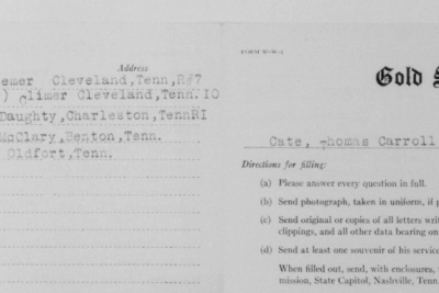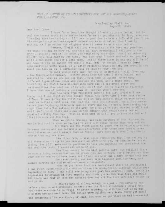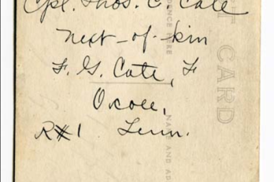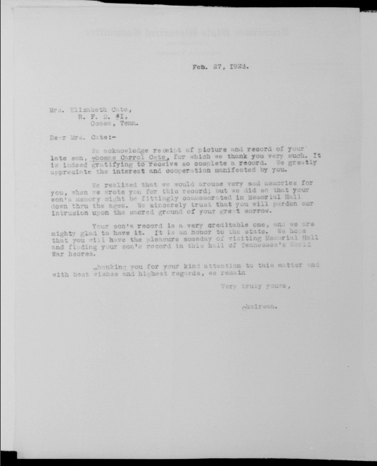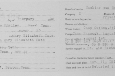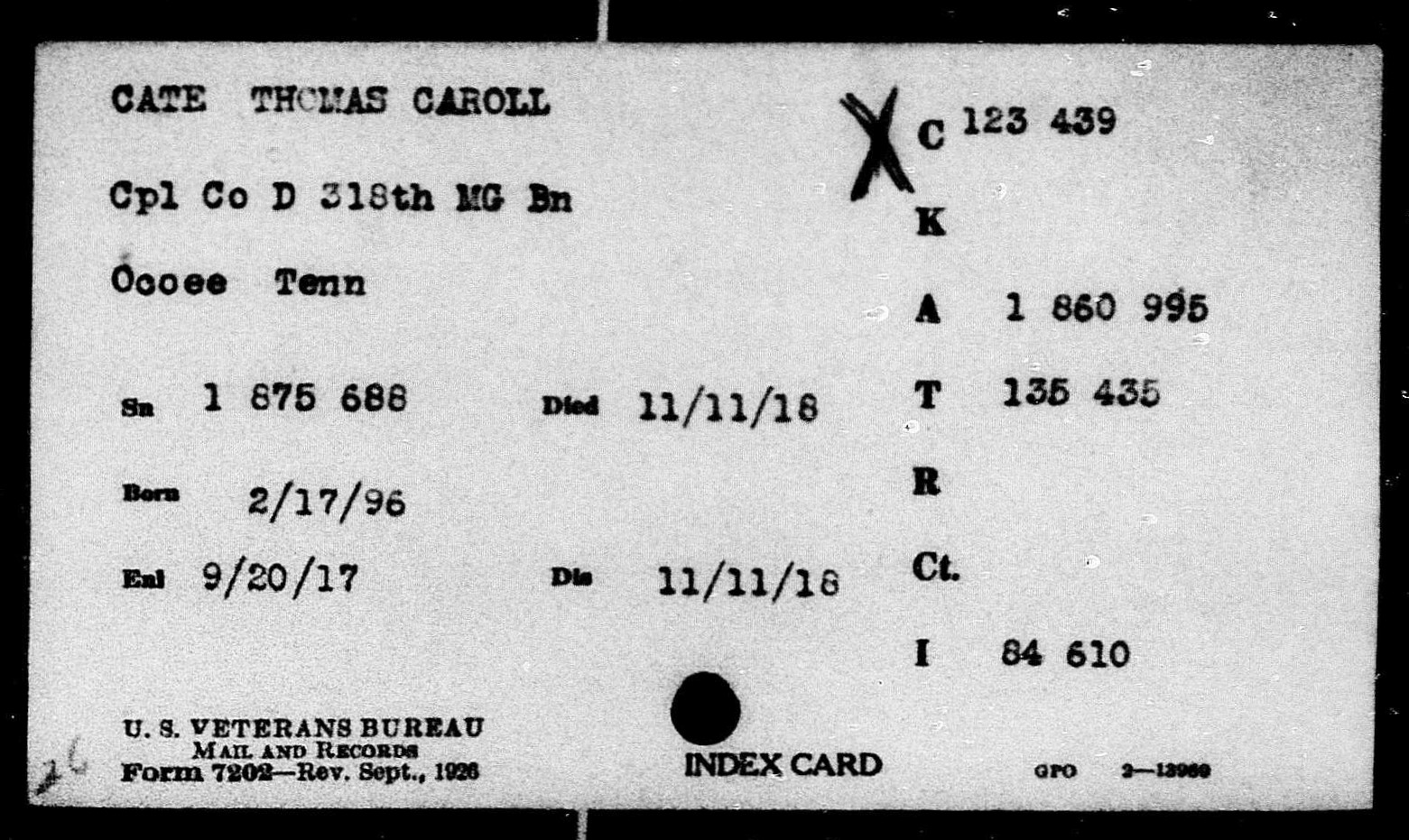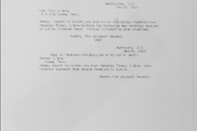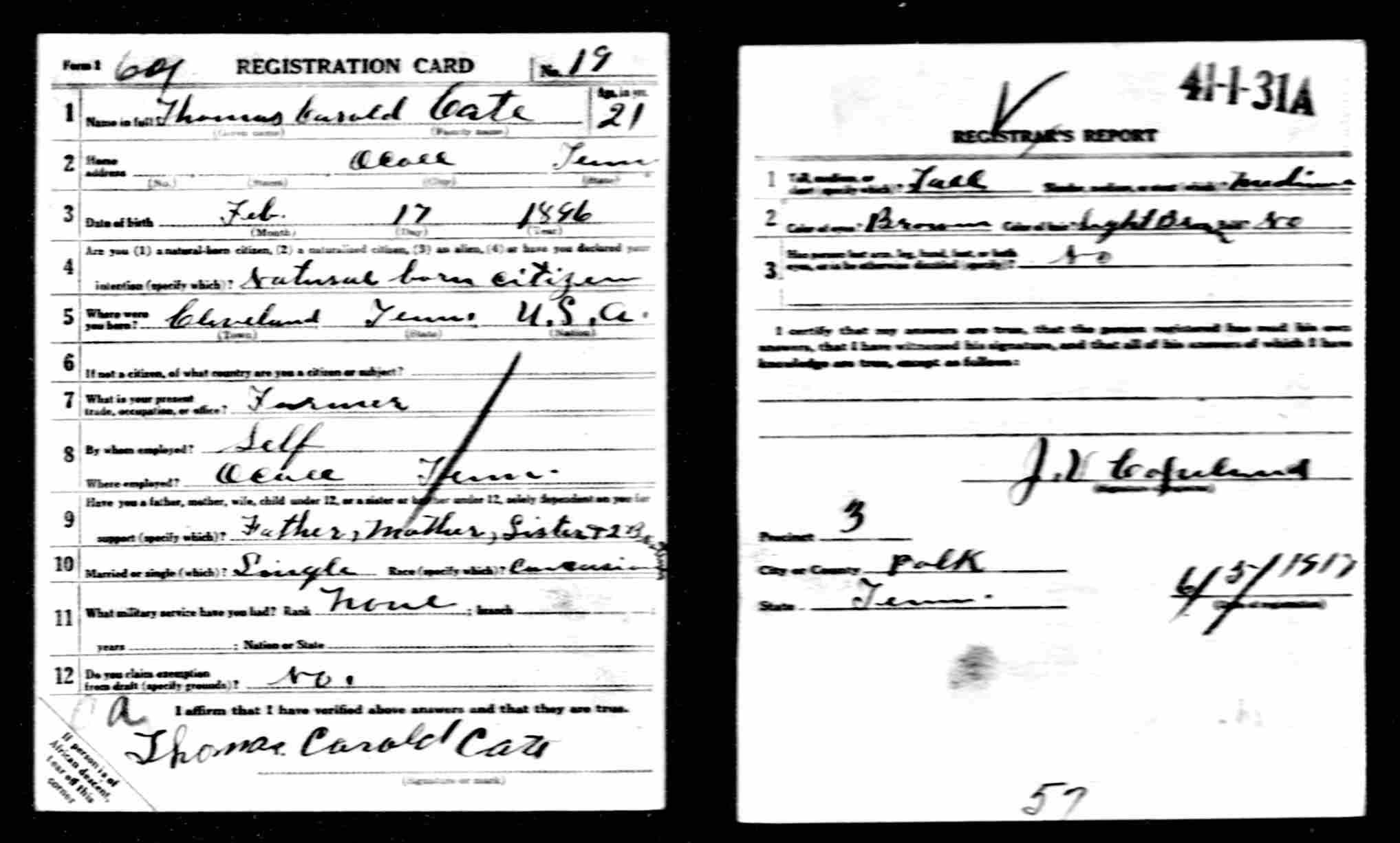 Thomas Carold (or Carroll) Cate was born 17 February 1896, Cleveland, Tennessee to Felix Grundy and Mary Elizabeth Cate. He entered the service on 20 September 1917 at Benton Tennessee and received his training at Camp Gordon in Atlanta, Georgia; Camp Jackson in South Carolina and Camp Hancock in Augusta, Georgia. He sailed to Europe on 1 August 1918, arriving on August 10.