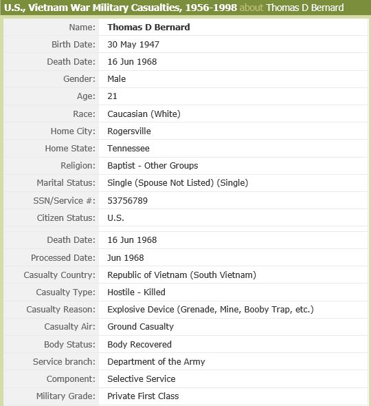 “We usually only used each other’s last names, so I didn’t know Tom’s first name until I looked him up on this website. I was there when he died. We were sweeping through a village. Bernard was making his way through a bamboo hedgerow when he triggered a booby trap. I went to see if there was anything I could do to help. One of our medics got there first and did all he could, but there was no hope. If I remember right, the fatal injury was to the back of his head. We had spent a fair amount of time swapping stories. There was always plenty of time for that. He was a farm boy from the South. I remember him telling me how to gain maximum cooperation from a balky horse. Seemingly an otherwise gentle sort, he said you had to beat the … out of a horse to get it to go along with your agenda. Not exactly a horse whisperer. I miss him.” -Bill Foreman