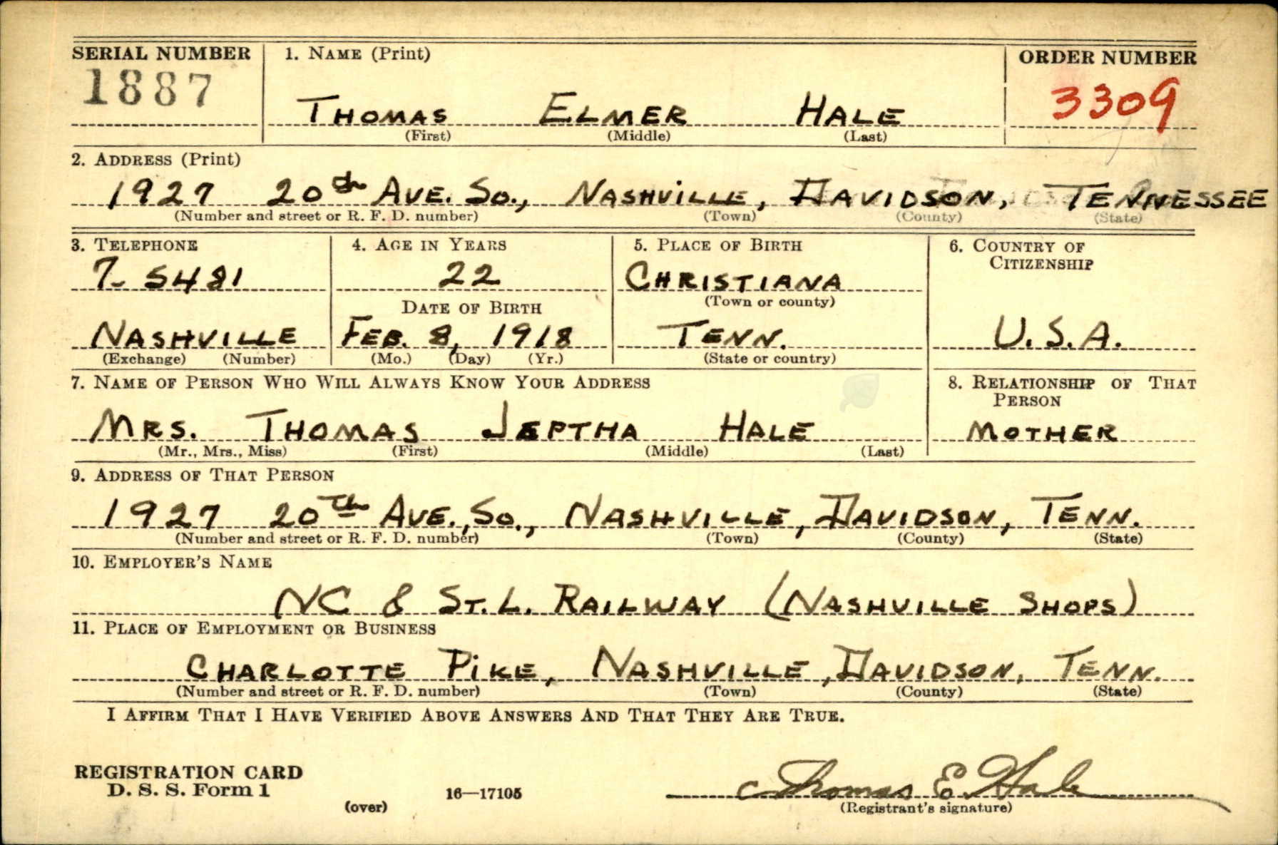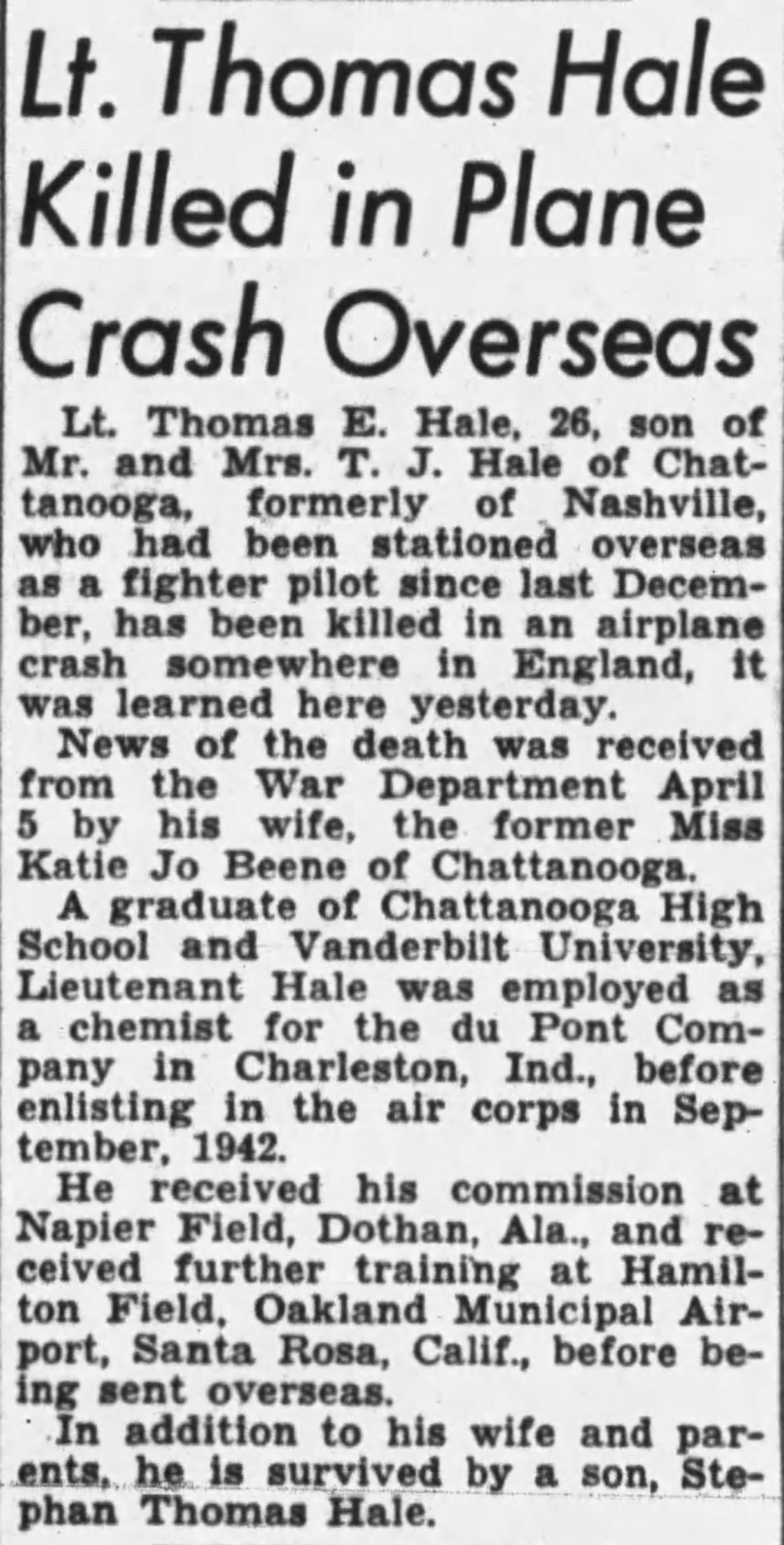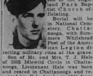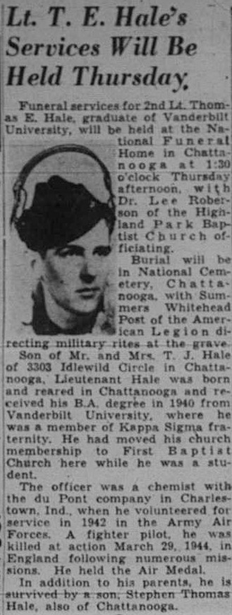 Son of Mr. and Mrs. T.J. Hale of 3303 Idlewild Circle in Chattanooga, Lieutenant Hale was born and reared in Chattanooga and received his B.A. degree in 1940 from Vanderbilt University, where he was a member of Kappa Sigma fraternity. He had moved his church membership to First Baptist Church here while he was a student. The officer was a chemist with the du Pont company in Charlestown, Ind., when he volunteered for service in 1942 in the Army Air Forces. A fighter pilot, he was killed in action March 29, 1944, in England following numerous missions. He held the Air Medal. In addition to his parents, he is survived by a son, Stephen Thomas Hale, also of Chattanooga.