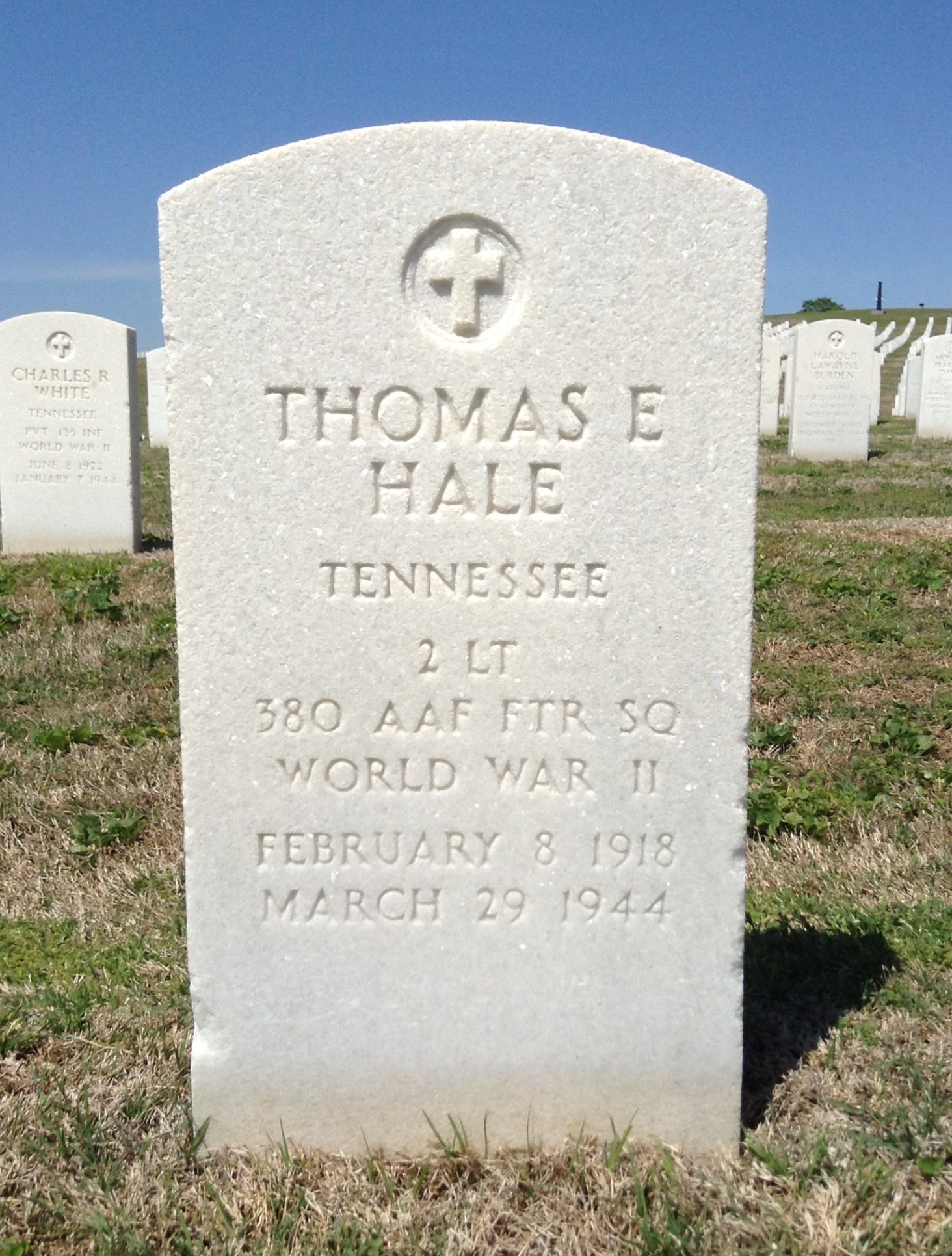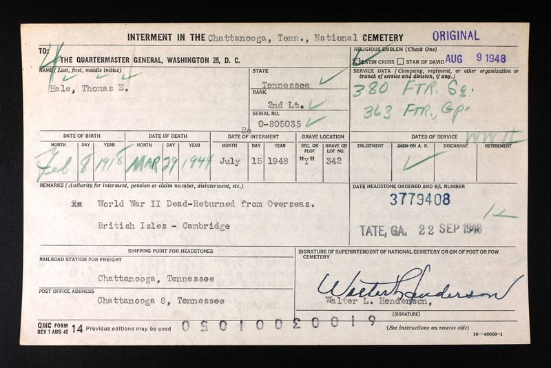 Thomas Elmer Hale was born 8 February 1918, the son of T.J. Hale. He was married to Katherine Jo Beene and father of Stephan Thomas Hale. He graduated at Chattanooga High School and Vanderbilt University in Nashville, Tenn. He was employed as a chemist for the du Pont Company in Charleston, Indiana before enlisting in the air corps in September, 1942. He received his commission at Napier Field in Dothan, Alabama and received further training at Hamilton Field at Oakland Municipal Airport in Santa Rosa, California before being sent overseas.