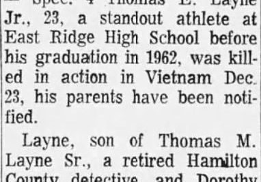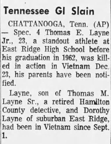 Spec. 4 Thomas E. Layne, Jr., 23, a standout athlete at East Ridge High School before his graduation in 1962, was killed in action in Vietnam Dec. 23, his parents have been notified. Ayne, son of Thomas M. Layne Sr., a retired Hamilton County detective, and Dorothy Layne of Suburban East Ridge, had been in Vietnam since Sept. 1