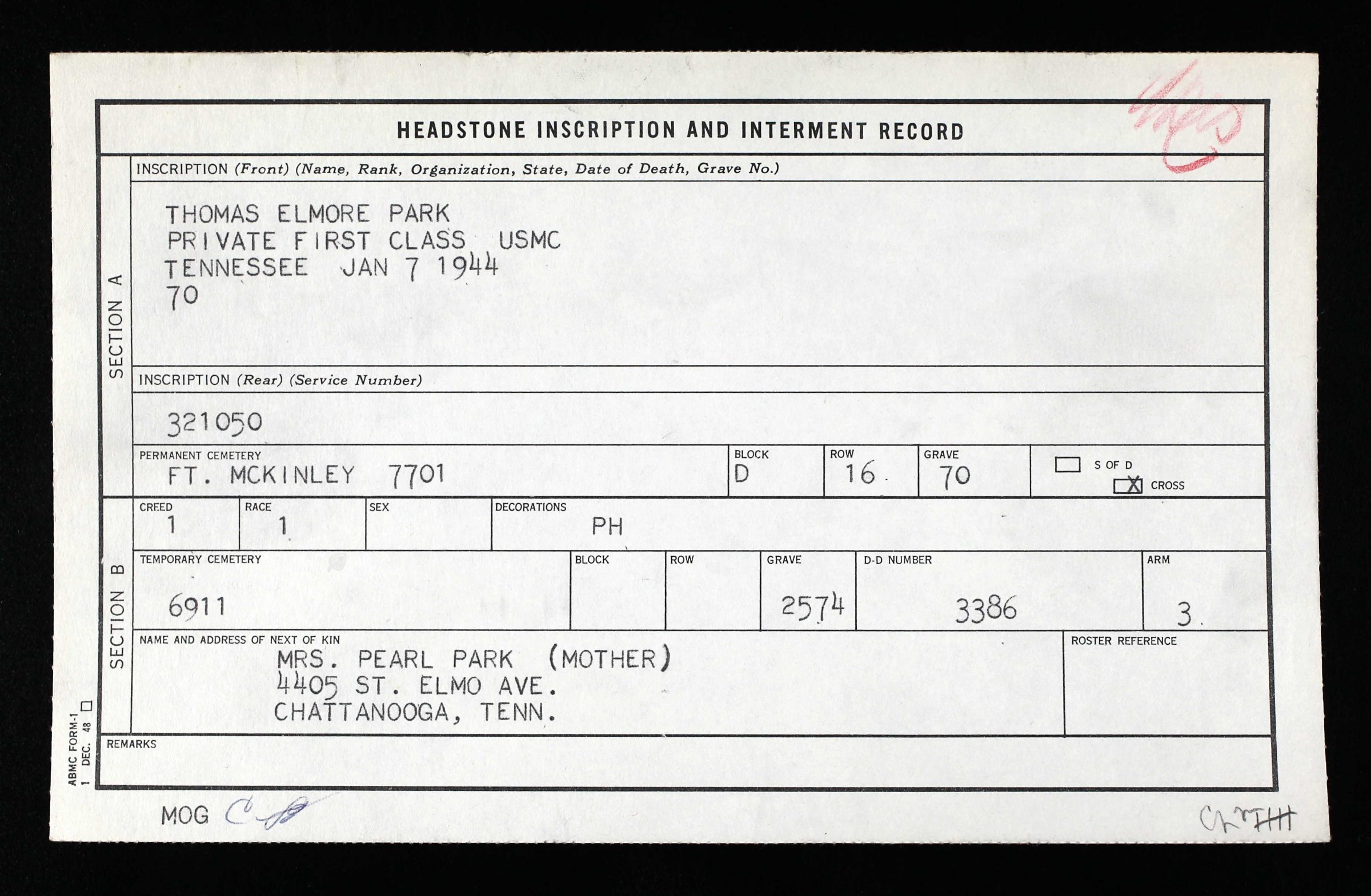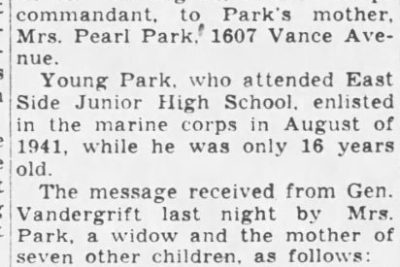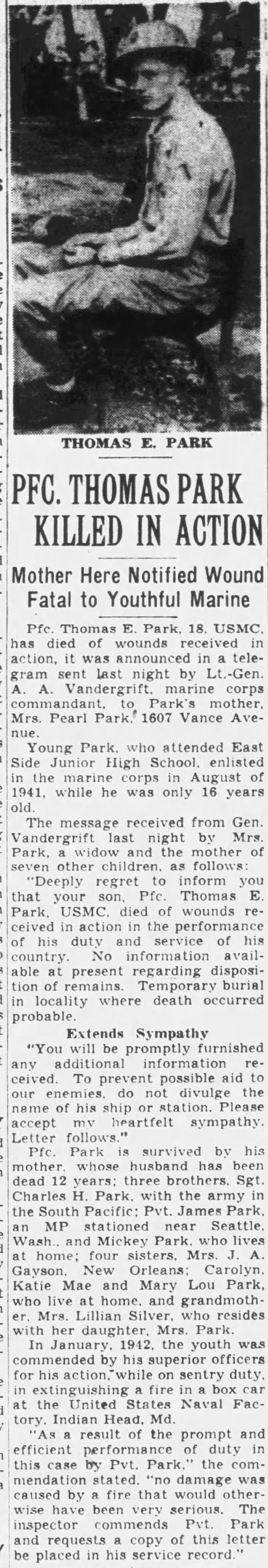Pfc. Thomas E. Park, 18, USMC, has died of wounds received in action, it was announced in a telegram sent last night by Lt.-Gen. A.A. Vandergrift, marine corps commandant to Park’s mother, Mrs. Pearl Park, 1607 Vance Avenue. Young Park, who attended East side Junior High School, enlisted in the marine corps in August of 1941, while he was only 16 years old. The message received from Gen. Vandergrift last night by Mrs. Park, a widow and the mother of seven other children, as follows: “Deeply regret to inform you that your son, Pfc. Thomas E. Park, USMC, died of wounds received in action in the performance of his duty and service of his country. No information available at present regarding disposition of remains. Temporary burial in locality where death occurred probable. You will be promptly furnished any additional information received. To prevent possible aid to our enemies, do not divulge the name of his ship or station. Please accept my heartfelt sympathy. Letter follows.”