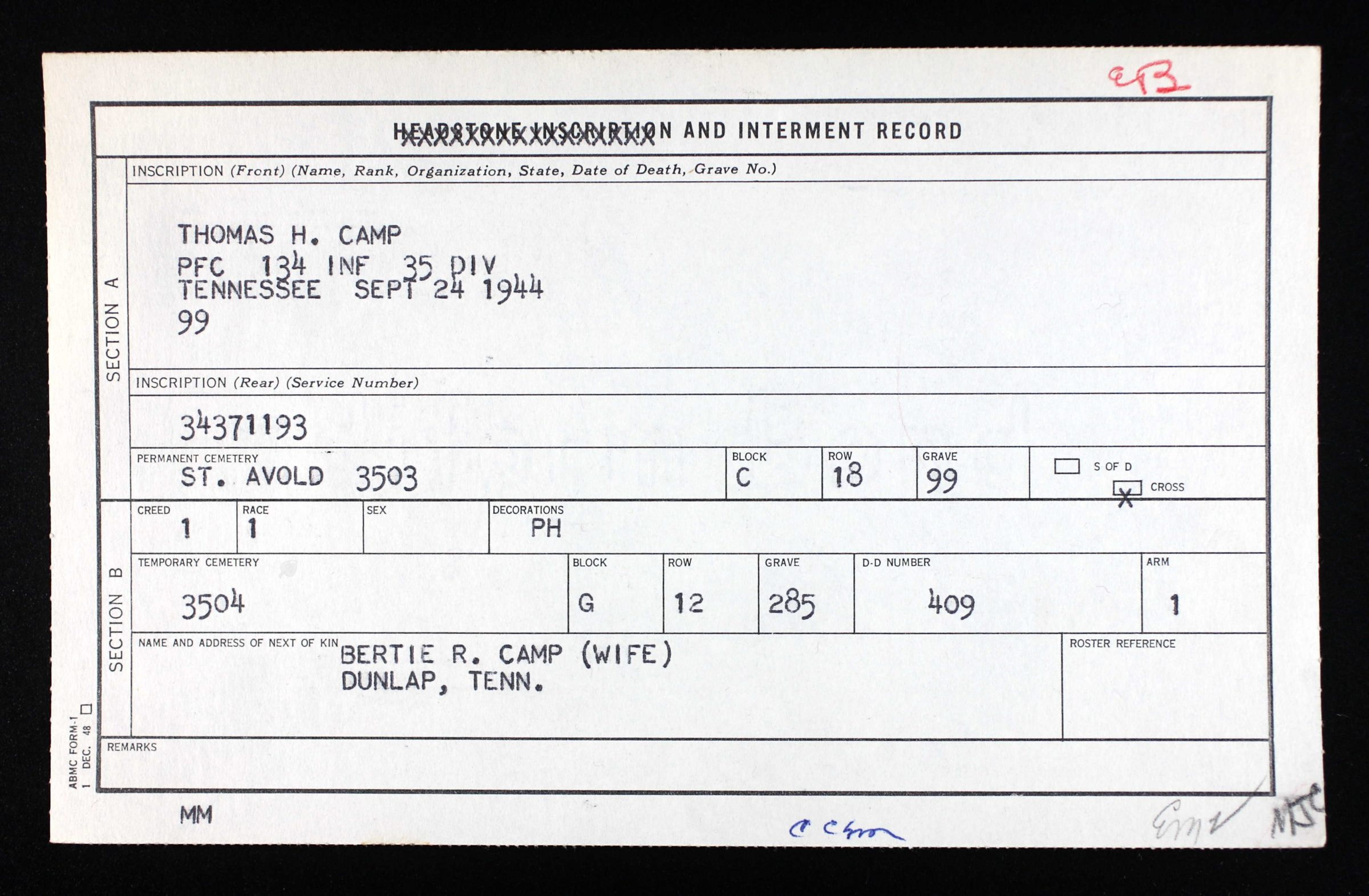 Private First Class Thomas H. Camp was assigned to the 134th Infantry Regiment, 35th Division. At the time of his death the 35th division was pushing across France, had crossed the Moselle River, secured the city of Nancy on 15 September 1944, and it was advancing towards Chambrey.