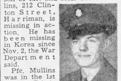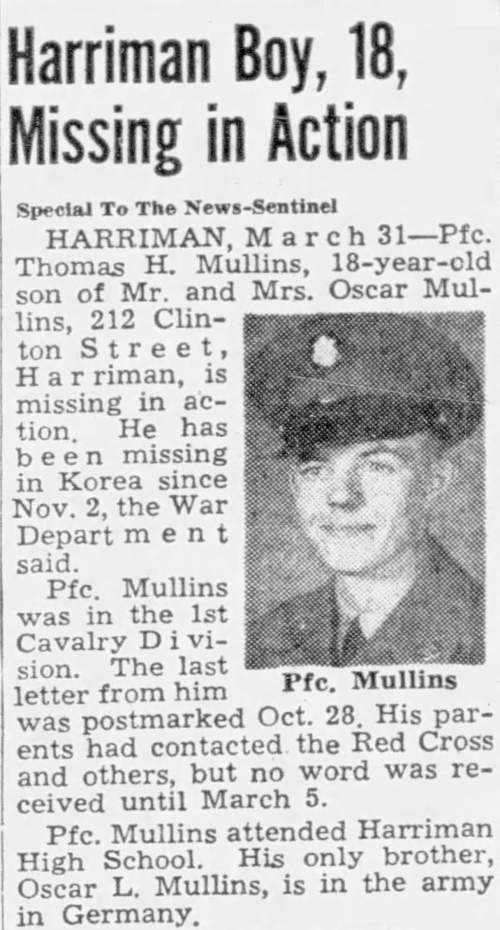 Pfc. Thomas H. Mullins, 18-year-old son of Mr. and Mrs. Oscar Mullins, 212 Clinton Street, Harriman, is missing in action. He has been missing in Korea since Nov. 2, the War Department said. Pfc. Mullins was in the 1st Cavalry Division. The last letter from him was postmarked Oct. 28. His parents had contacted the Red Cross and others, but no word was received until March 5. Pfc. Mullins attended Harriman High School. His only brother, Oscar L. Mullins, is in the army in Germany.