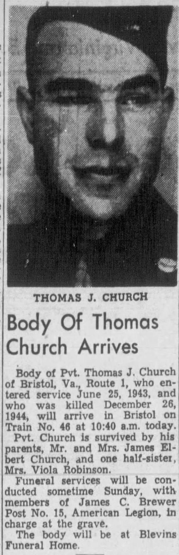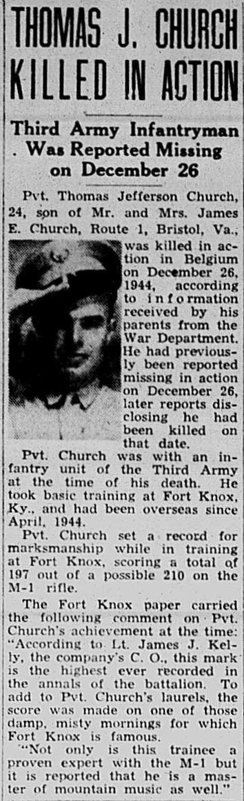 He was killed in action in 1944 in Belgium and buried in Bristol, Virginia. His body was not returned to his father until March 1949.