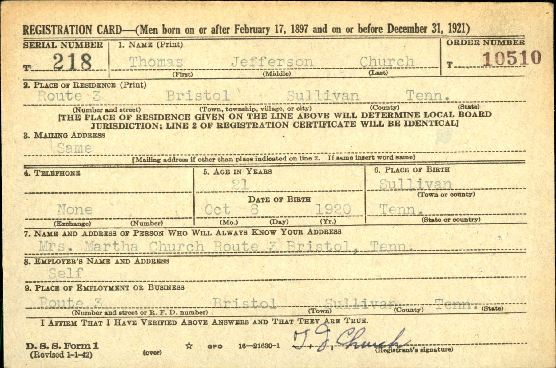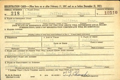Private Thomas Jefferson Church was born in 1920 in Georgia, the son of James Elbert Church and Martha L. Robinson. He lived in Goodson, Washington Co., VA with his father when he enlisted at Fort Oglethorpe, Georgia. Goodson is now Bristol, VA. His father was a farmer, and Thomas Church was a helper on his father’s farm. He enlisted on 3 July 1943 at Fort Oglethorpe, Georgia.