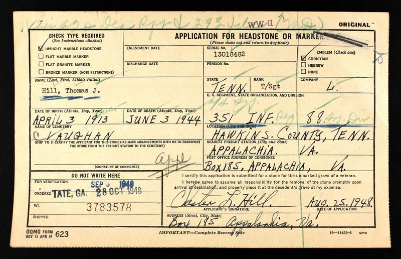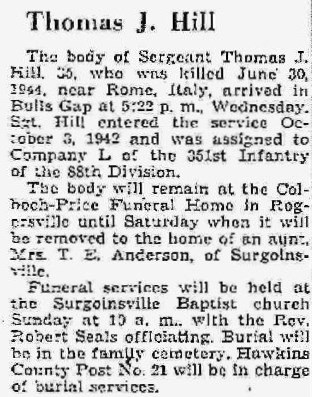The body of Sergeant Thomas J. Hill, 35, who was killed near Rome, Italy, arrived in Bulls Gap. Sgt Hill entered the service October 3, 1942 and was assigned to Company L of the 351st Infantry of the 88th Division.