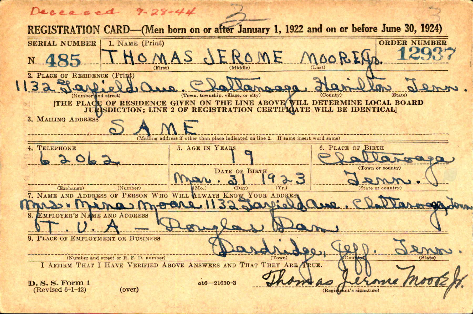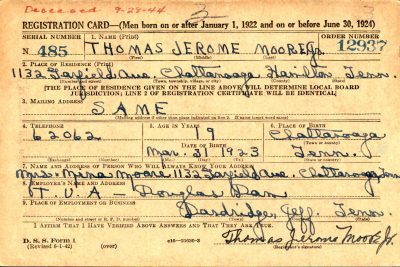 Thomas Jerome Moore Jr. was born on 31 March 1923 at Chattanooga, Tennessee, the son of Thomas Jerome Moore and Nina Wilson.