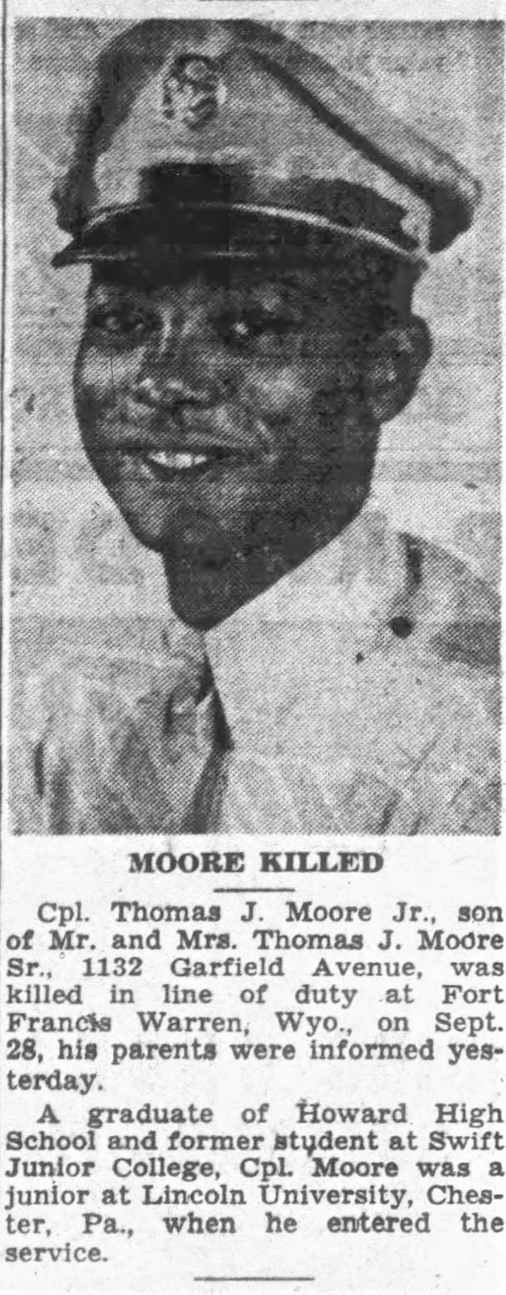Cpl. Thomas J. Moore Jr., son of Mr. and Mrs. Thomas J. Moore Sr., 1132 Garfield Avenue, was killed in the line of duty at Fort Francis Warren, Wyo., on Sept. 28, his parents were informed yesterday. A graduate of Howard High School and former student at Swift Junior College, Cpl. Moore was a junior at Lincoln University, Chester, Pa., when he entered the service.