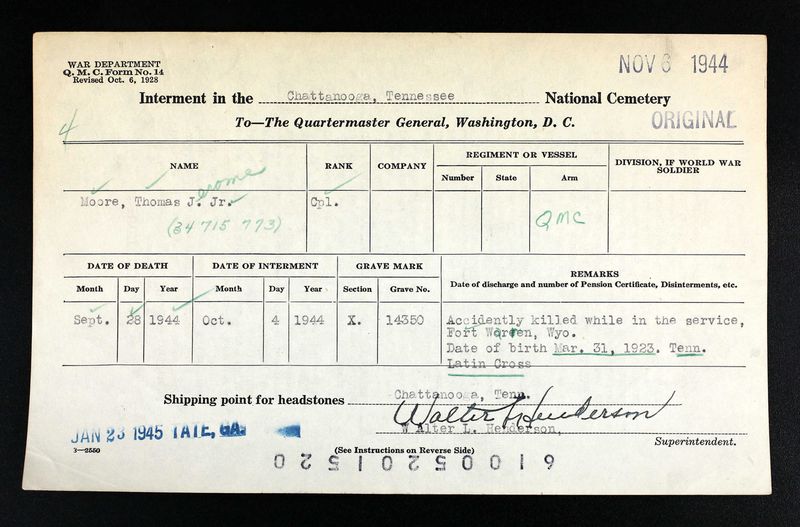 Cpl Moore was accidently killed while in the service at Fort Warren, Wyoming.