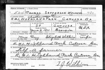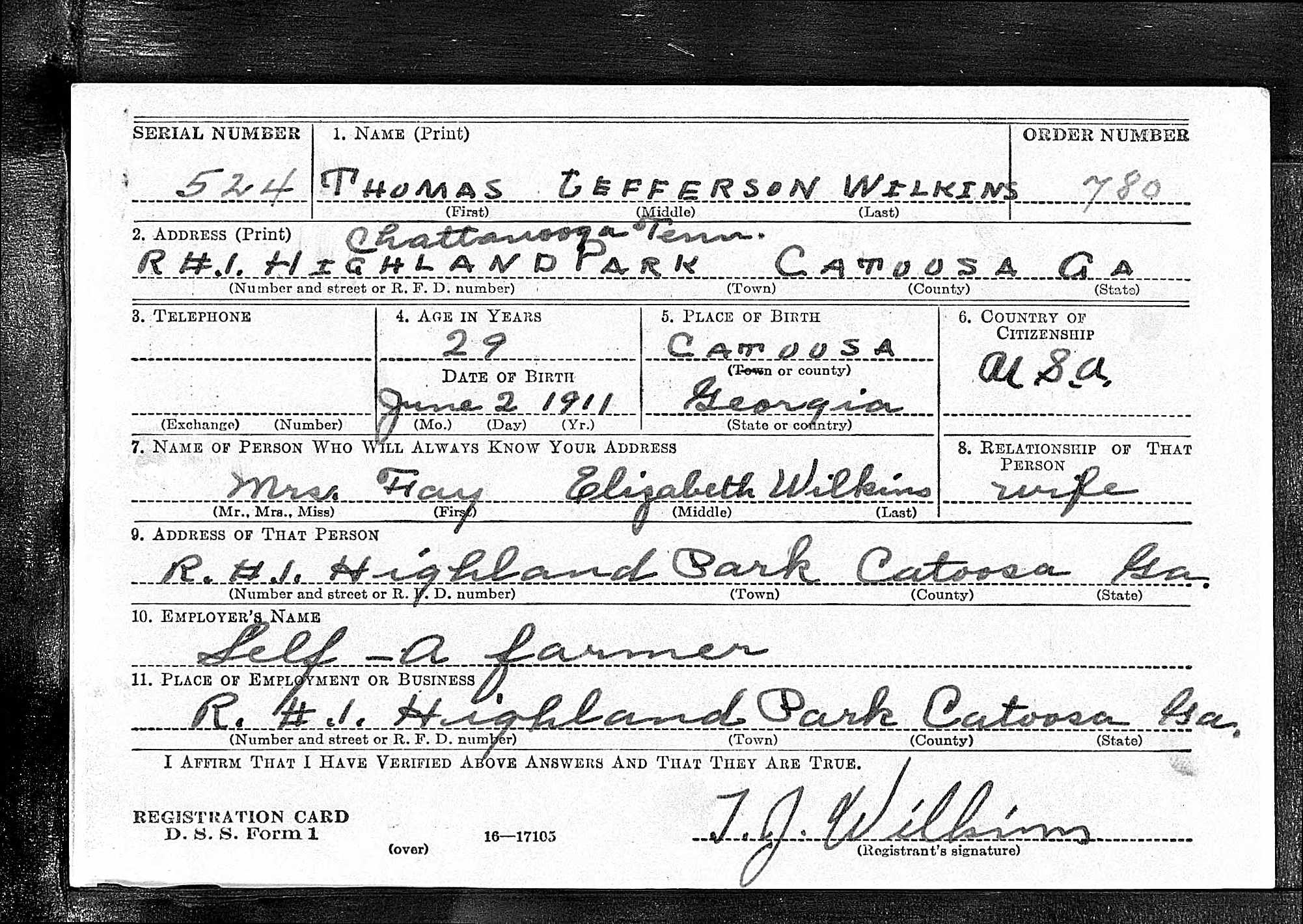 Thomas Jefferson Wilkins was born on 2 June 1911 at Catoosa, Georgia to John Wilkins and Mary Edith Scruggs. He was the husband of Faye Elizabeth Tate and father of Thomas Fred Wilkins.