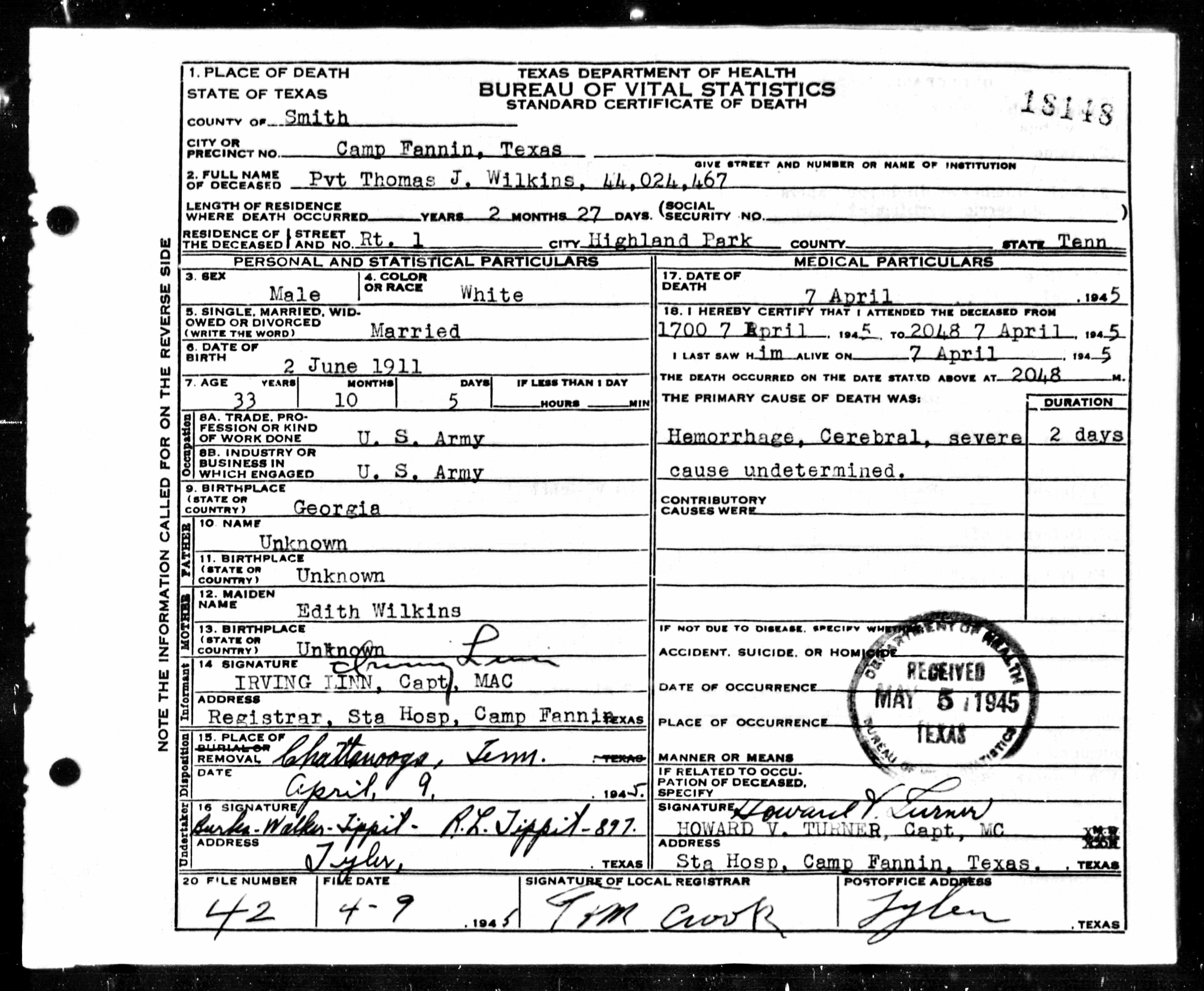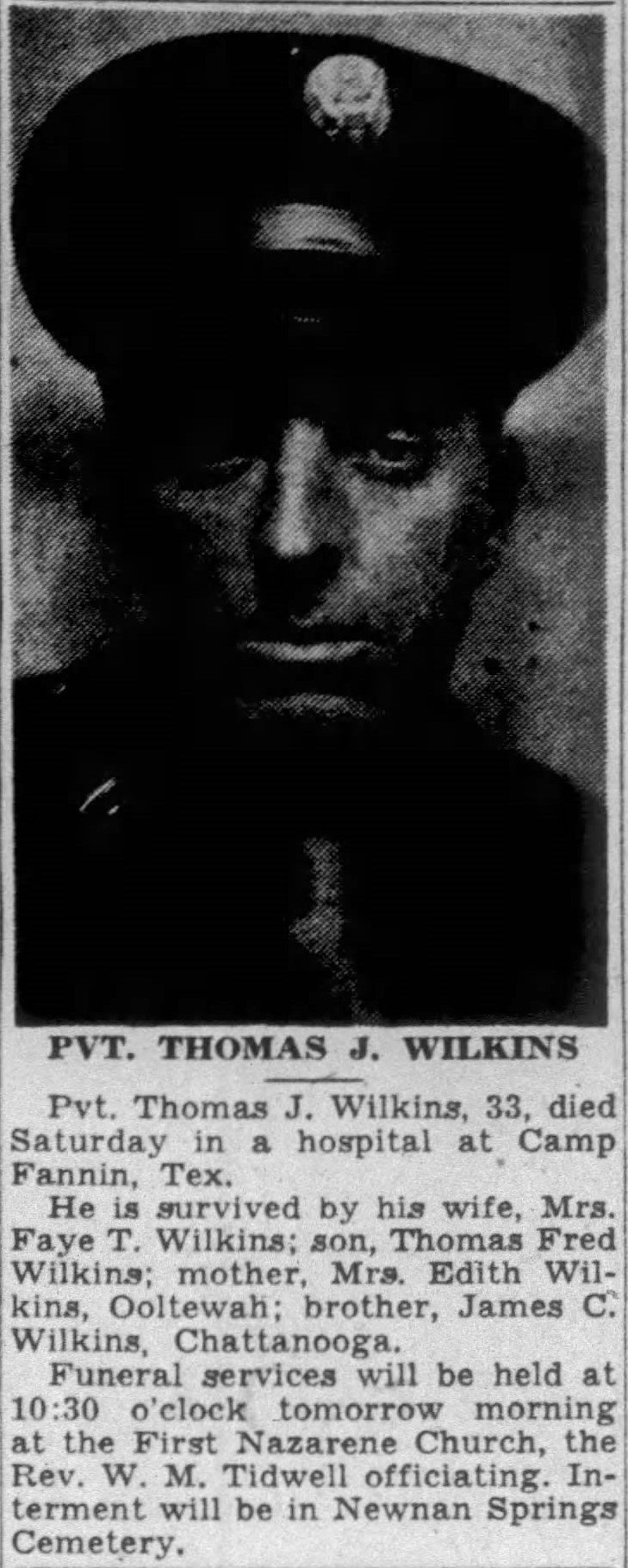 Pvt Wilkins died at Camp Fannin in Texas of hemorrhage, cerebral, cause undetermined. He is buried at Newnan Springs Cemetery, Catoosa County, Georgia.