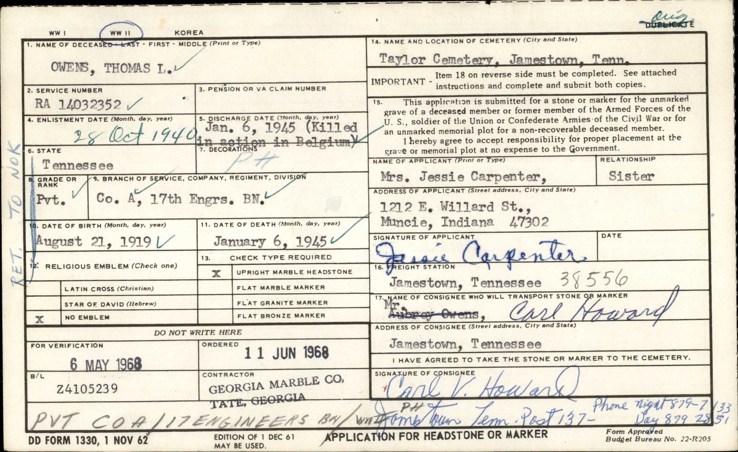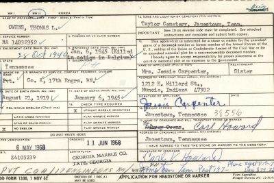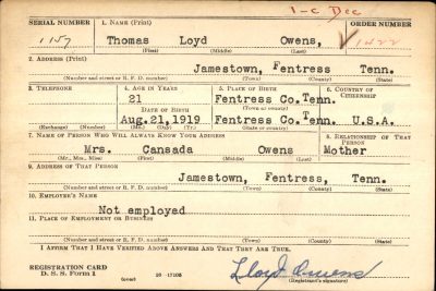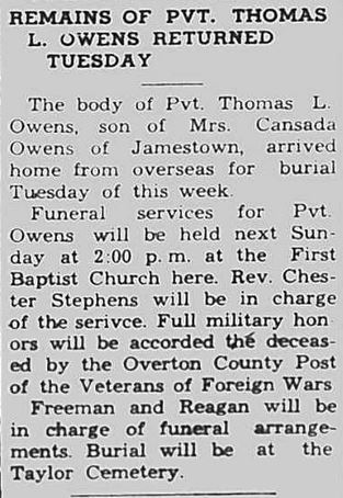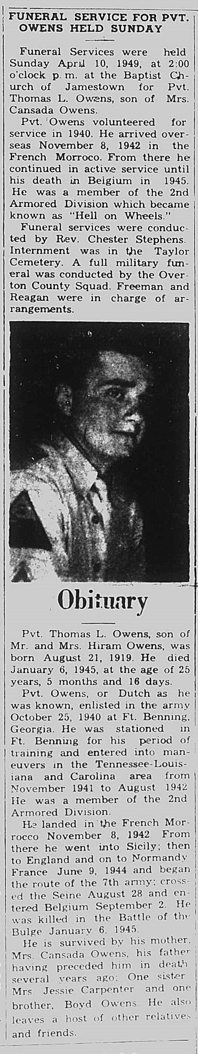 Pvt. Thomas L. Owens, son of Mr. and Mrs. Hiram Owens, was born August 21, 1919. He died January 6, 1945 at the age of 25 years, 5 months and 16 days. Pvt. Owens, or Dutch as he was known, enlisted in the army October 25, 1940 at Ft. Benning, Georgia. He was stationed in Ft. Benning for his period of training and entered into maneuvers in the Tennessee-Louisiana and Carolina area from November 1941 to August 1942. He was a member of the 2nd Armored Division. He landed in the French Morrocco November 8, 1942. From there he went into Sicily; then to England and on to Normandy France, June 9, 1944 and began the route of the 7th army; crossing the Seine August 28 and entered Belgium September 2. He was killed in the Battle of the Bulge January 6, 1945. He is survived by his mother, Mrs. Cansada Owens, his father having preceded him in death several years ago; one sister, Mrs. Jessie Carpenter and one brother, Boyd Owens. He also leaves a host of other relatives and friends.